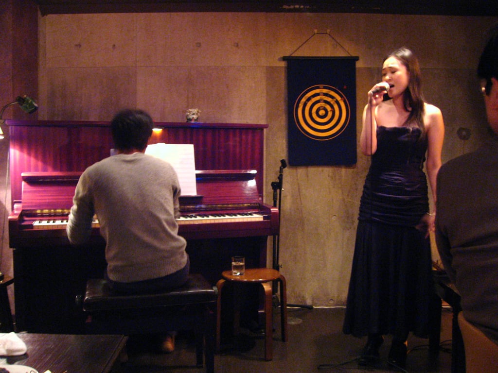 A-Un is a tiny hidden-away bar in the twisty alleys just north of Shinjuku, a gem in rough for those who are fortunate to find it. Walking down through the modest entry leads to a small underground bar with an upright piano and a spot for vocalists or other musicians. On a typical night, a pair of vocalists will share the stage and take turns singing jazz standards and pop classics with piano accompaniment. Adding to the convivial atmosphere in the cozy room, the performers may also spend time mingling with the customers during breaks.