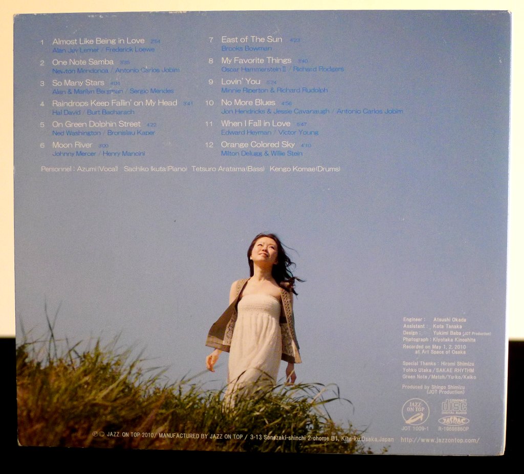 With the essence of soft blues and pure whites like the album design itself, Azumi’s delicate voice floats gracefully over the music with a sunny confidence well suited to her outlook as an evangelist for happy living. Like both jazz and life, balancing tradition and novel reinvention, moments of glowing energy surface alongside the swinging beats and slower ballads, especially when pianist Sachiko Ikuta and the band sets loose with vigorous improvisation and heavier rhythms.