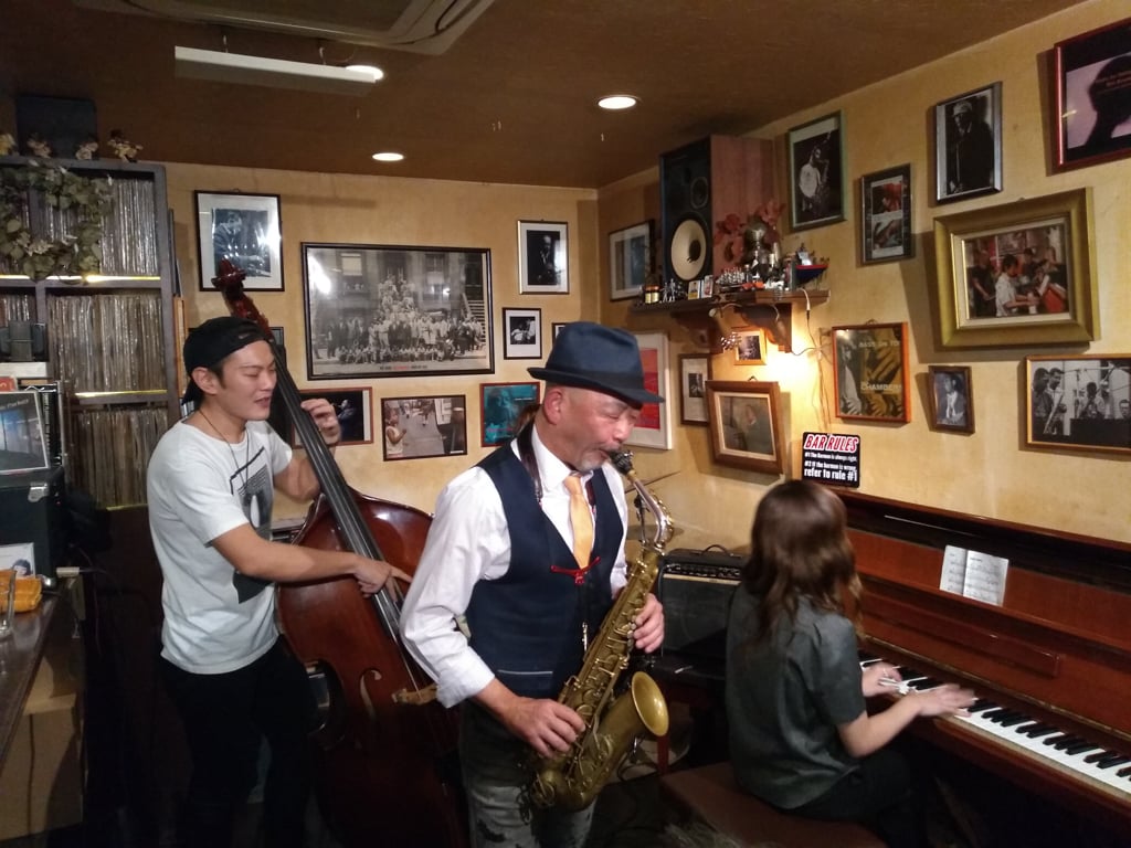 Well worth visiting for top-quality jazz and an enthusiastic and friendly owner Morikawa-san, Birdland is a top choice for authentic live jazz. While Birdland no longer features live jazz on a nightly basis, the shop has special live shows on occasion, typically once a week. The interior space is cozy with a nice bar which may seasonally sport a large green plant rising from the bar and spreading branches and leaves up towards the ceiling. Facing the bar is an upright piano, and snug in the corner is a drum set, in front of which an upright bass, with space for a horn player or two to just squeeze in, right up against the front bar and tables.