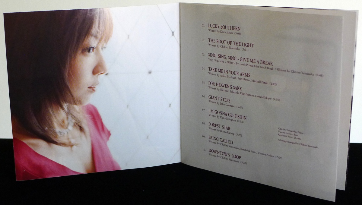 Tracks one through four consist of Keith Jarrett’s “Lucky Southern” (in vibrant good moods), Yamanaka’s “The Root of the Light” (with liquid organ and hairpin curves), Louie Prima’s “Sing, Sing, Sing” together with Yamanaka’s “Give Me a Break” (vivid and exciting, switching between piano and keyboard), and the nearly hundred-year old romantic song “Take Me in Your Arms”, also played uptempo in straight swing for true jazz piano trio bona fides.