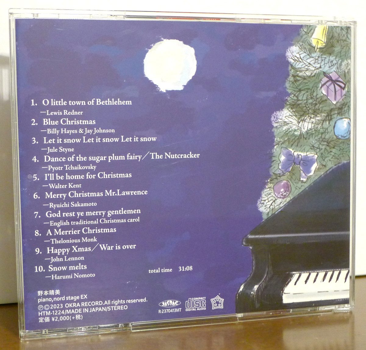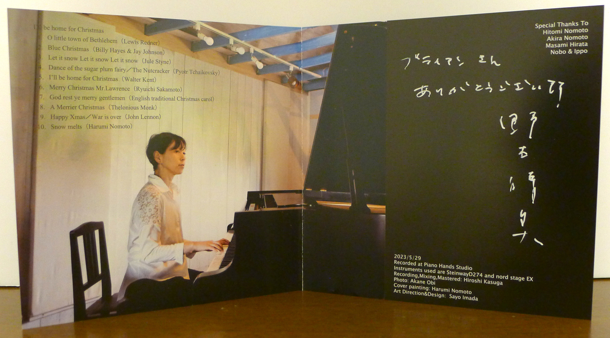 In addition to traditional carols and Christmas classics, Nomoto also plays a few pop- and jazz-aligned tunes. John Lennon’s #9 “Happy Xmas (War Is Over)” is always popular in Japan at this time of year and gets a friendly, gospel-y solo piano treatment. Similarly, #6 “Merry Christmas Mr. Lawrence” is another iconic and nostalgic instrumental theme in Japan, originating from the 1983 Japanese film and soundtrack of the same name, and it is often featured in Christmas playlists despite its not being written specifically as a holiday song. #2 “Blue Christmas” is a groovy rock-and-roll country song that Elvis sung and made more popular. Perhaps the song here with the deepest jazz credentials is track #8, “A Merrier Christmas”, a rare, unrecorded holiday piece written by Thelonious Monk for his family.
