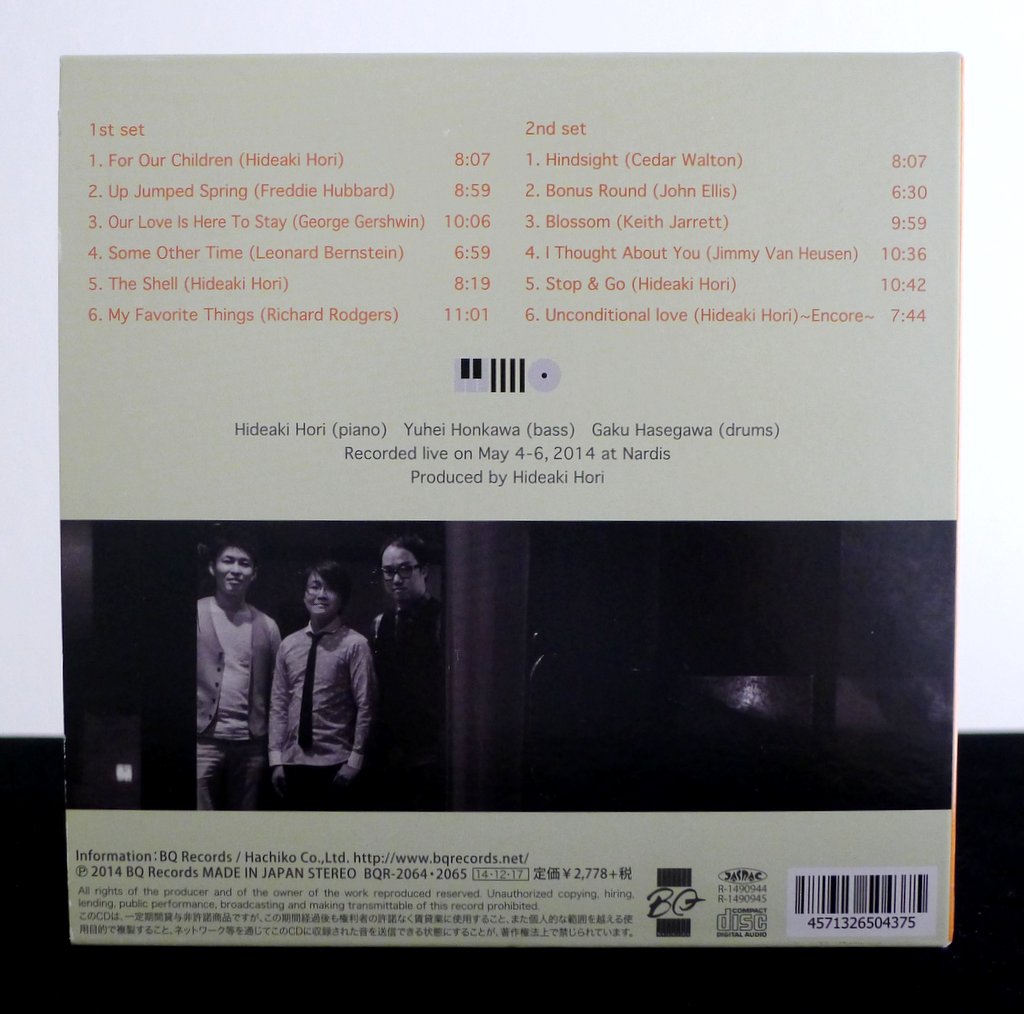 The twelve songs include four originals by Hori (the funky “The Shell” and high-energy “Stop & Go” thrill the audience), some classic standards (“Up Jumped Spring”, “I Thought About You”, “My Favorite Things”) and choice modern picks from the likes of Cedar Walton, Keith Jarrett, and John Ellis (his “Bonus Round” is a special treat). Through these carefully chosen pieces, dynamics range from comfortable, mid-tempo swing, to fiery and up-tempo bop. For balance and breathing space, a few pretty ballads are included, including a fascinating version of Keith Jarrett’s “Blossom” which enraptures the club with a musical spell.