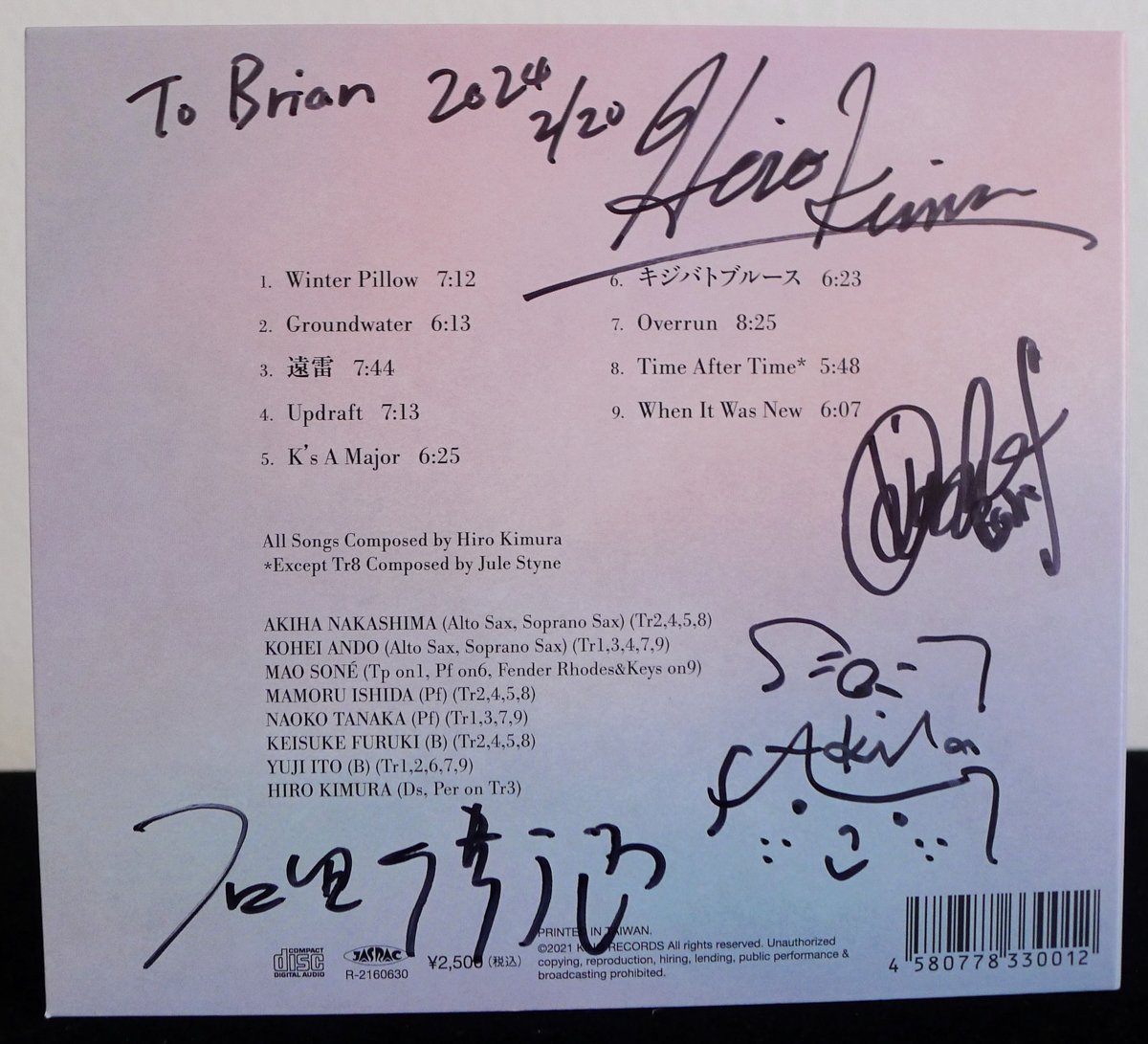Along with his crystal clear and clean-cut drumming, this debut from Kimura also showcases to a large degree his writing style with jazz, mainly, but also pop and Brazilian musical influences. There is straight modern jazz composing with personality (#1 “Winter Pillow”, #2, “Groundwater”, #3 “Enrai”, #4 “Updraft”), melancholy infused with folk or ethnic influences (#5 “K’s A Major”, #6 “Gijibato Blues”), and cool-down, laid-back grooves (#8 “Time After Time”, #9 “When It Was New”).