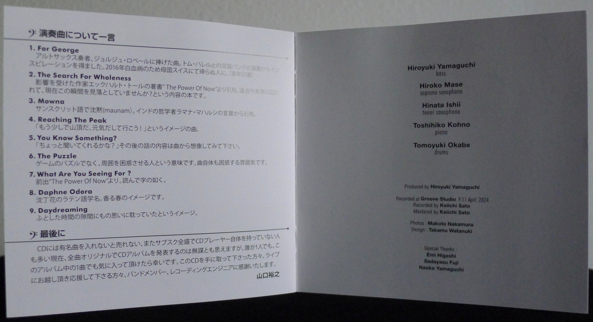 At a time when CDs that do not include famous songs may not sell well, and when subscription services are so popular that many people don’t own CD players, it may seem reckless to release an album of all original songs on compact disc. But, even if just one person likes a song on this album, I’ll be happy. I am grateful to everyone who bought this album, those who support us at our live shows, the band members, and the recording engineer.