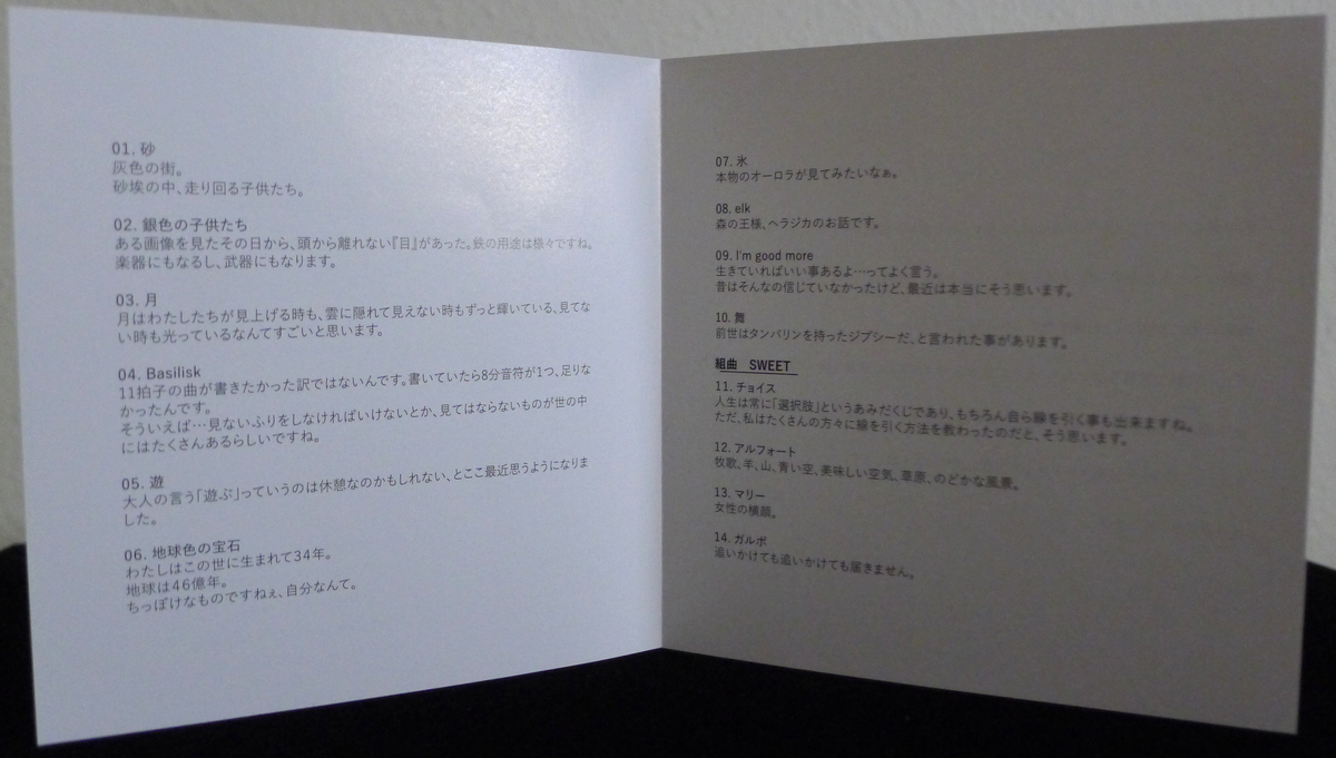 The final four short songs make up a suite starting with track #11. Here, the wordplay hidden in the album title finally clicks: suite/sweet. In addition, the title of each short song in the suite (“Choice” [チョイス], “Alfort” [アルフォート], “Marie” [マリー], and “Galbo” [ガルボ]) is also cleverly chosen, as each song names a famous Japanese sweet, a brand of chocolate or butter cookies and biscuits commonly seen in supermarkets and Japanese convenience stores. Inspired by the sweets, Aikawa uses them as appetizing musical ingredients for creating musical visions out of them. #11 “Choice” is straight-laced with bubbling heat, #12 “Alfort” is a folky up-and-down march, #13 “Marie” is dreamy and melancholy, and #14 “Galbo” is a swift jazz-classical quickstep to the exit.