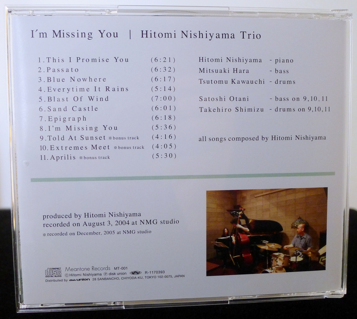 I’m Missing You is the prolific composer’s first album, which quickly sold out as she was gaining recognition for her distinctive jazz piano compositional style, a novel approach that melded her Japanese classical musical training, studies in jazz piano, and her affection for European modern jazz. The original 2004 album contained eight songs, all composed by Nishiyama, and was re-released in 2007 with three bonus tracks from around the same period. It came to be regarded as her breakthrough first trio recording, released 20 years before her latest CD Echo, and with more than two dozen albums released in between.