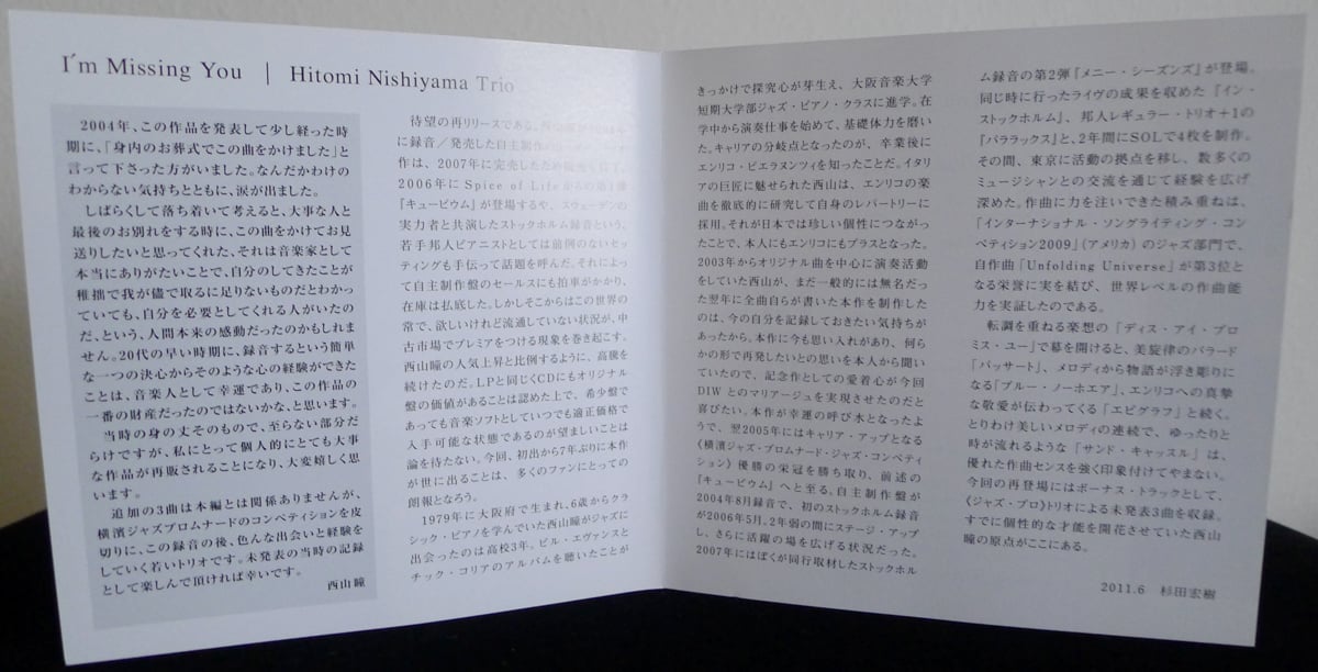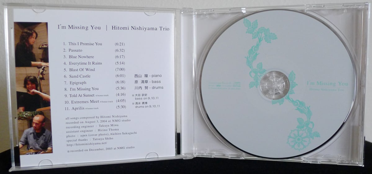For interested pianists and jazz musicians, Nishiyama also graciously provides simplified piano charts for some of her original songs in the Extra area of her website. This includes charts for “Blue Nowhere”, “Epigraph”, and “Passato”, three absolute highlights from I’m Missing You.