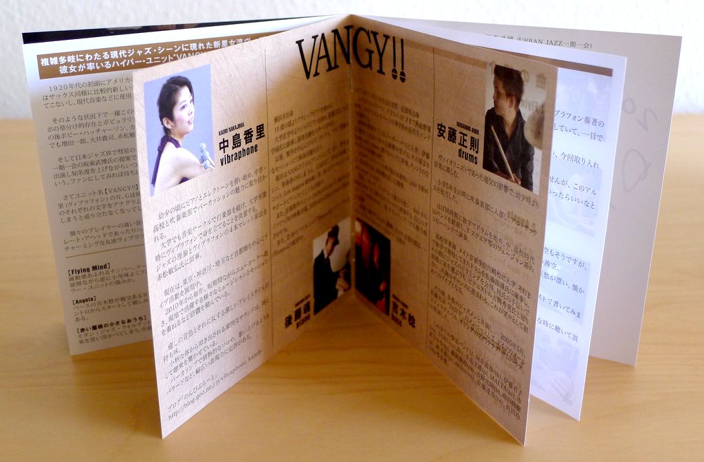 Kaori Vibes Quartet is a jazz quartet centered around the lovely ringing bell-tones of jazz vibraphone. After three years of playing together, the group formerly known as Vangy!! (note the vibraphone mallets “!!” in the name) released their eagerly awaited debut album Flying Mind in 2013, much to fans’ delight.