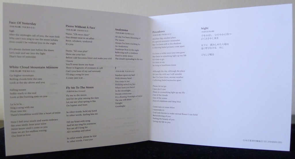Included on the duo album El Cant Dels Ocells (2012) with bassist Daiki Yasukagawa. This was originally written with a vocal impression, so I asked to have lyrics added to it.