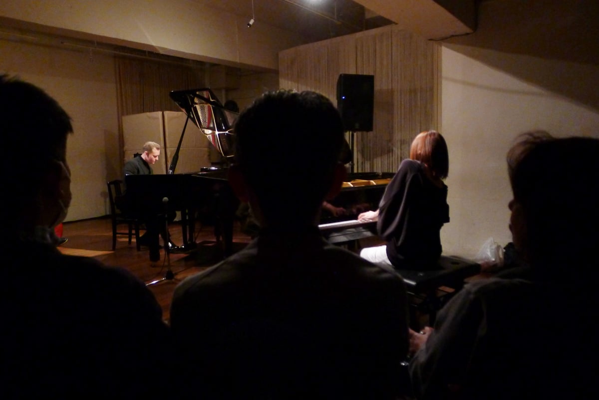 The seating section is modestly furnished with simple wooden chairs and a few tables. The interior layout is adjustable, so the stage area and audience seating can be arranged based on the event. The space is open and allows for flexible rearrangement of performance space and seating depending on the performance. Another bonus at a place like this, Koen-Dori Classics is one of the few jazz spaces with two grand pianos available for duo piano performances, a valuable feature.