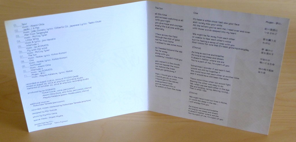 Along with songs sung in English, Japanese, and Portuguese, the vocalist Nobie often features her voice as an instrument, wordlessly doubling and counterpointing the tandem flute and piano in complex arrangements and soaring improvisation.