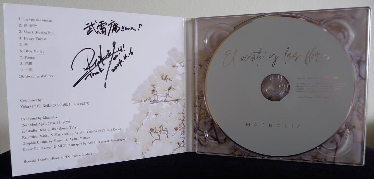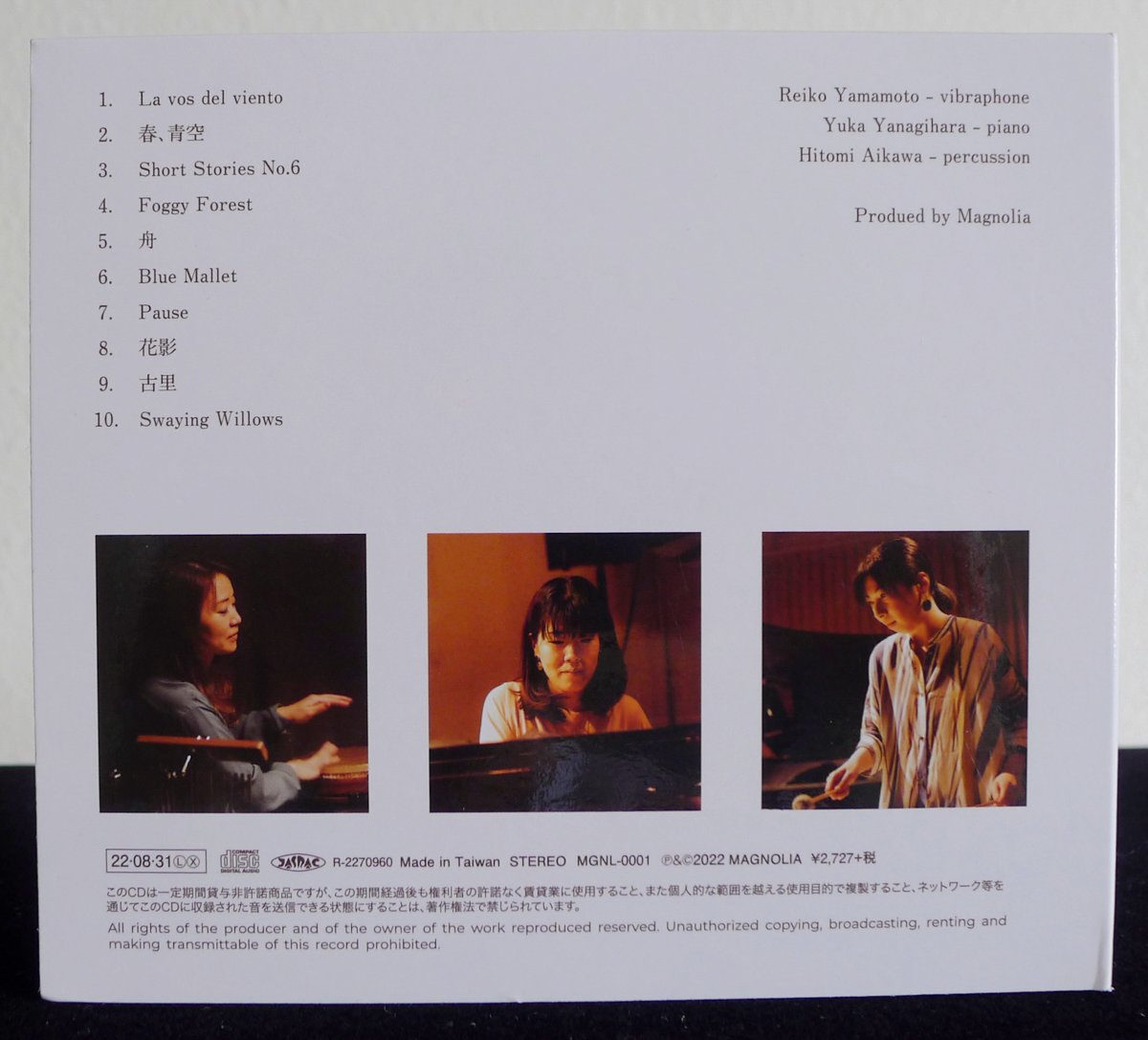Magnolia is a trio made up of vibraphone, piano, and percussion, and their debut album, El viento y las flores was released in 2022. This fifty-six-minute album contains ten tracks of all original compositions, four from vibraphonist Reiko Yamamoto and three each from pianist Yuka Yanagihara and percussionist Hitomi Aikawa. Despite having three independent composers, their tight interplay and musical personalities seem tightly bound together, as if their collective music just blooms out intuitively unified.