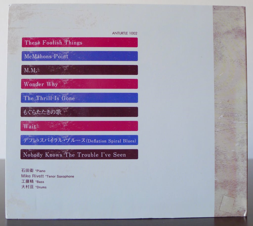 Ishida arranged all of the music aside from Omura’s and Rivett’s compositions. Basically, Ishida decided on the overall flow of each song and the order of solos, leaving the individual improvisation and such to each player, with each player’s performance inspiring one another’s playing. On “The Thrill Is Gone”, the melody statement is not played even once, a concept seemingly hinted at by Lee Konitz on his album Motion. “Deflation Blues” was performed with Ishida deciding on just the solo order, that the melody would not be played at the start, but at the ending in a wicked mood.