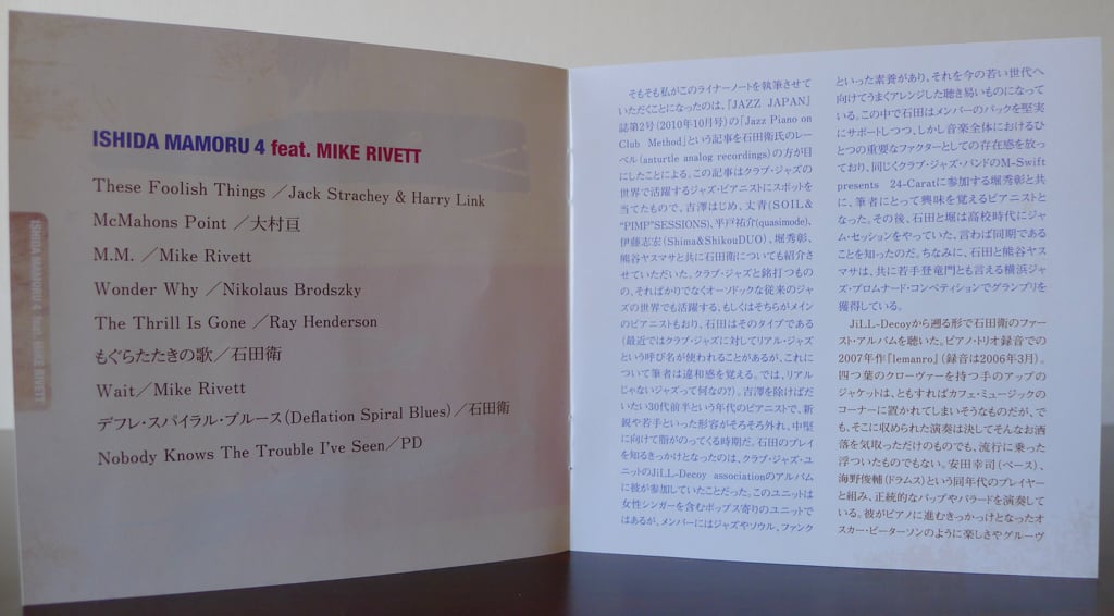Pianist Mamoru Ishida’s second album is titled /Ishida Mamoru 4 feat. Mike Rivett /and was released in 2011. With nine tracks over fifty-two minutes, the album presents a mix of covers, standards, and original compositions. The warm ballad “These Foolish Things” invites listeners in comfortably with a nostalgic calm, introducing a graceful jazz combo that respects traditional forms and songs loved by jazz fans.