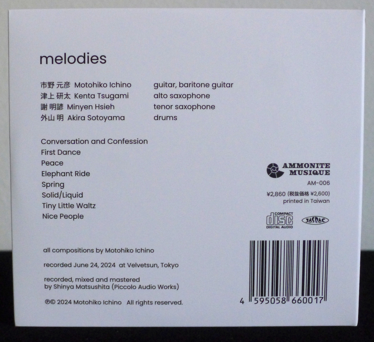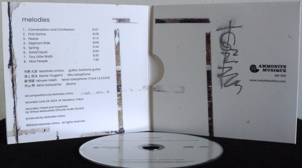 This four-member group consists of Ichino on guitar and baritone guitar, Kenta Tsugami on alto saxophone, Minyen Hsieh on tenor saxophone, and Akira Sotoyama on drums. As this quartet has no bass player, they form a subtly floating, bass-less group sound. Yet Ichino’s guitar work fills up the space nicely, especially when he subs in baritone guitar. All of the songs on Melodies were written by Ichino, and the album was recorded at a live performance at Velvet Sun in Tokyo on June 24, 2024.