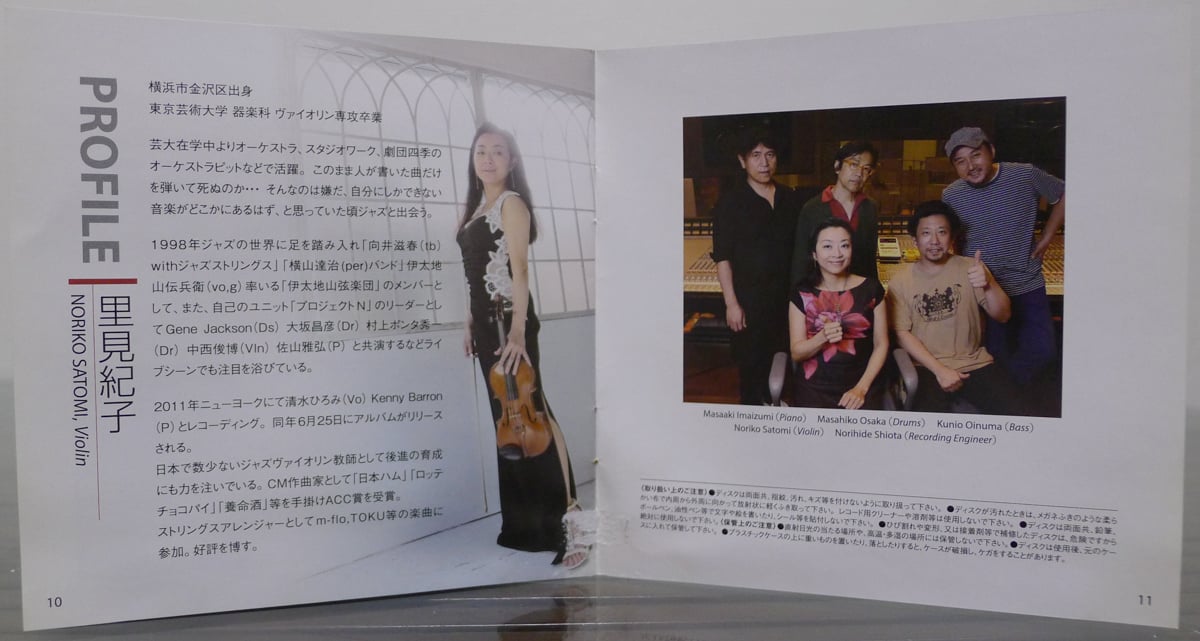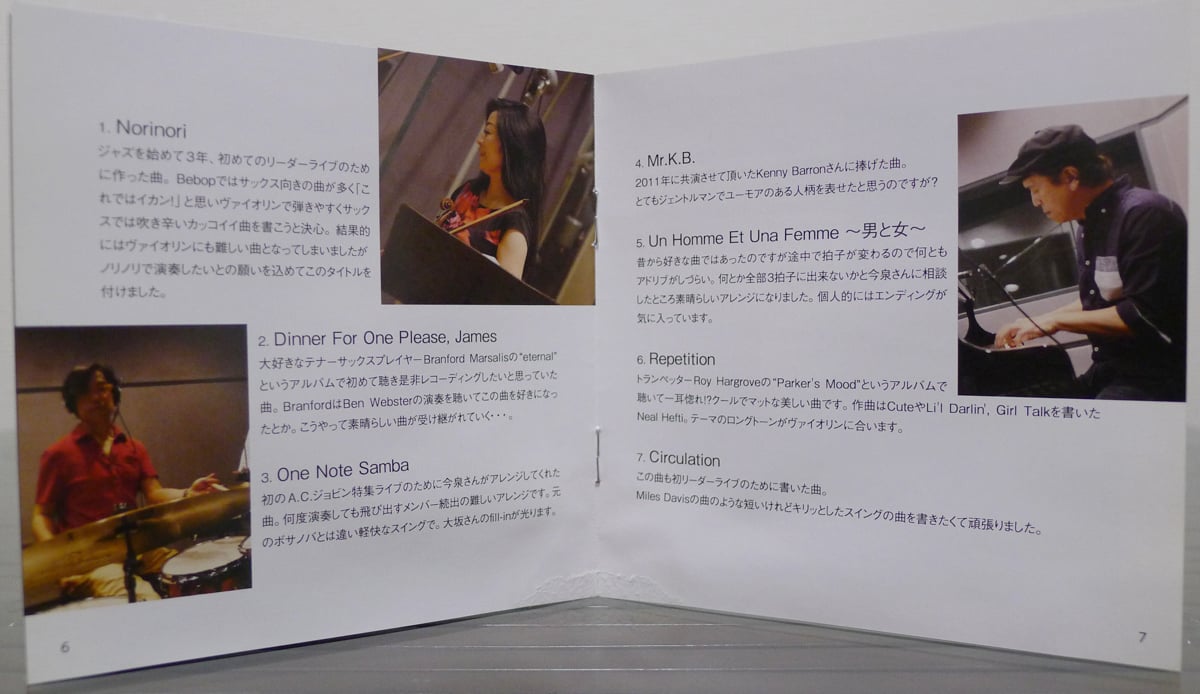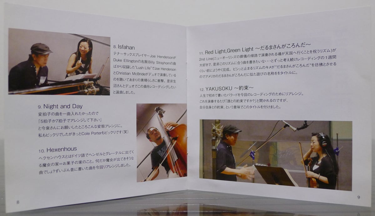 Naturally, the spotlight focuses on Satomi as the main lead performer, and while there are violin solos on every track, there are also plenty from pianist and arranger Imaizumi, who receives almost an equal number of opportunities to shine. In addition, his song arrangements enhance the music and include novel surprises like breaks for drum fills on #3 “One Note Samba” and a modern 7/4 arrangement of #9 “Night and Day”.