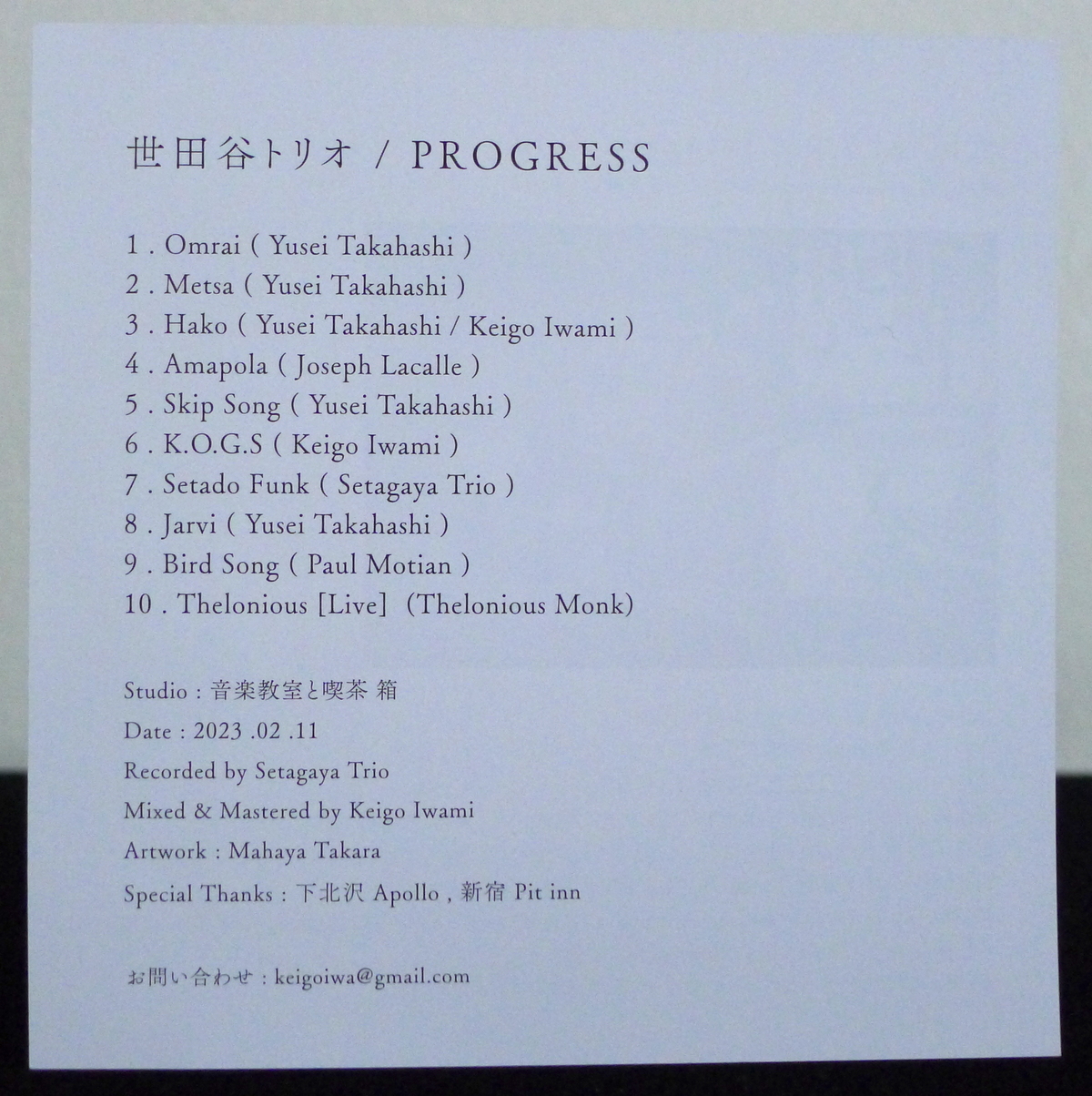 Released in 2024 on Setagaya Trio as Progress.