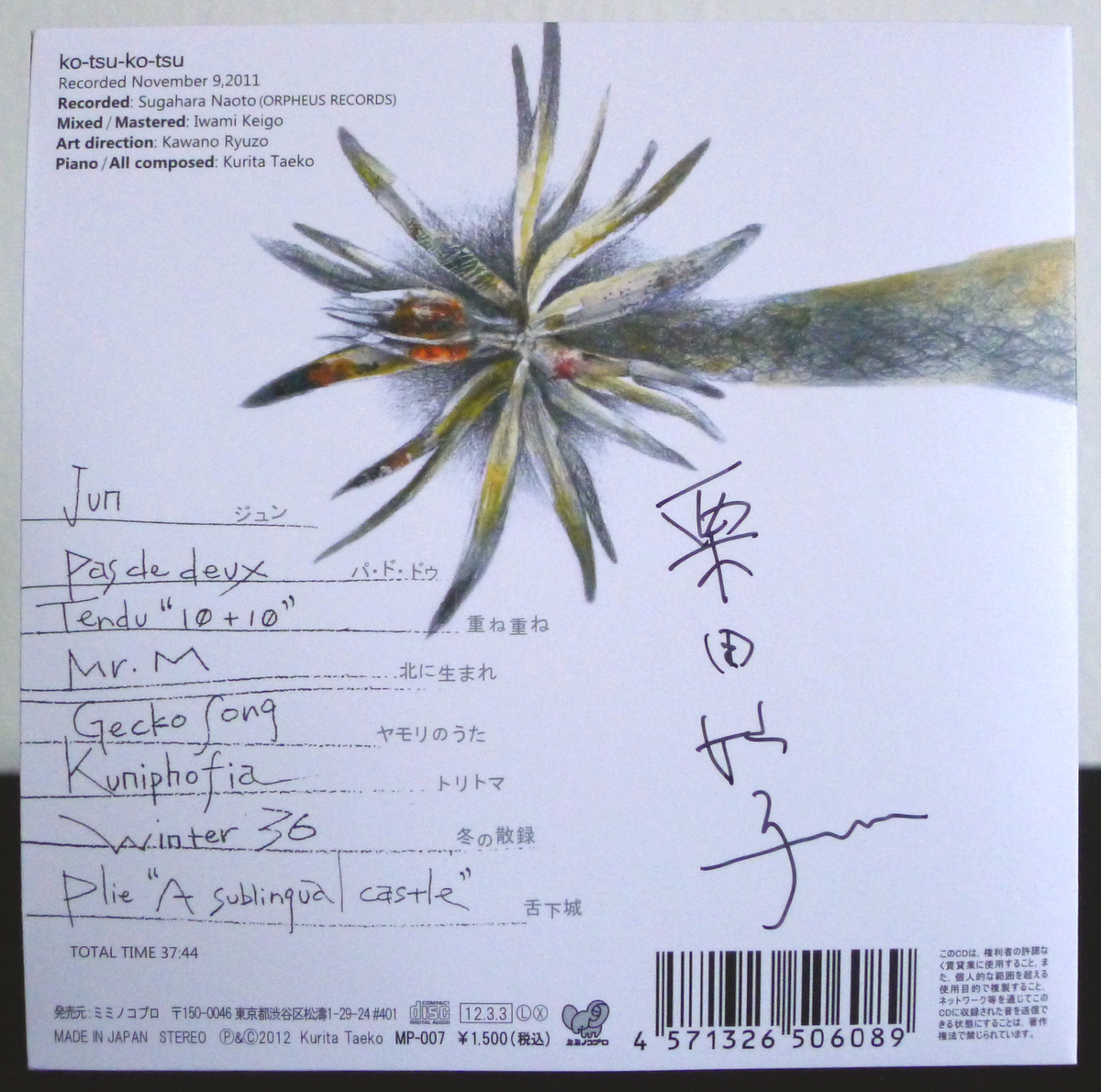 The album contains eight original songs and runs for a satisfying thirty-eight minutes. I’ll avoid over-describing the songs track-by-track here, and just say that this music is a lot like Duo, with Kurita keeping time while constructing melodies that are catchy and wonderous with a calming moderation. The entire album can be heard online through the playlist link below. In general, it’s beautiful solo piano music that is mellow and sleek. Some of it is powerfully escapist in creating scenes based on other worlds and ideas (in a receptive environment and like good music in general, surely). Highlights include the light rock of track #1 “Jun” (a version of this song is also on Duo), the haunting #2 “Pas de deux”, the adventurous #4 “Mr. M”, and the sweet and emotional #8 “Plie ‘A Sublingual Castle’”. While Duo also had three river-themed songs, Ko-tsu-ko-tsu contains three songs with titles related to ballet and dance (“Pas de deux”, “Tendu ‘10 + 10)’”, and “Plie ‘A Sublingual Castle’”. Like with rivers, writing for ballet seems to be another magnet for Kurita.