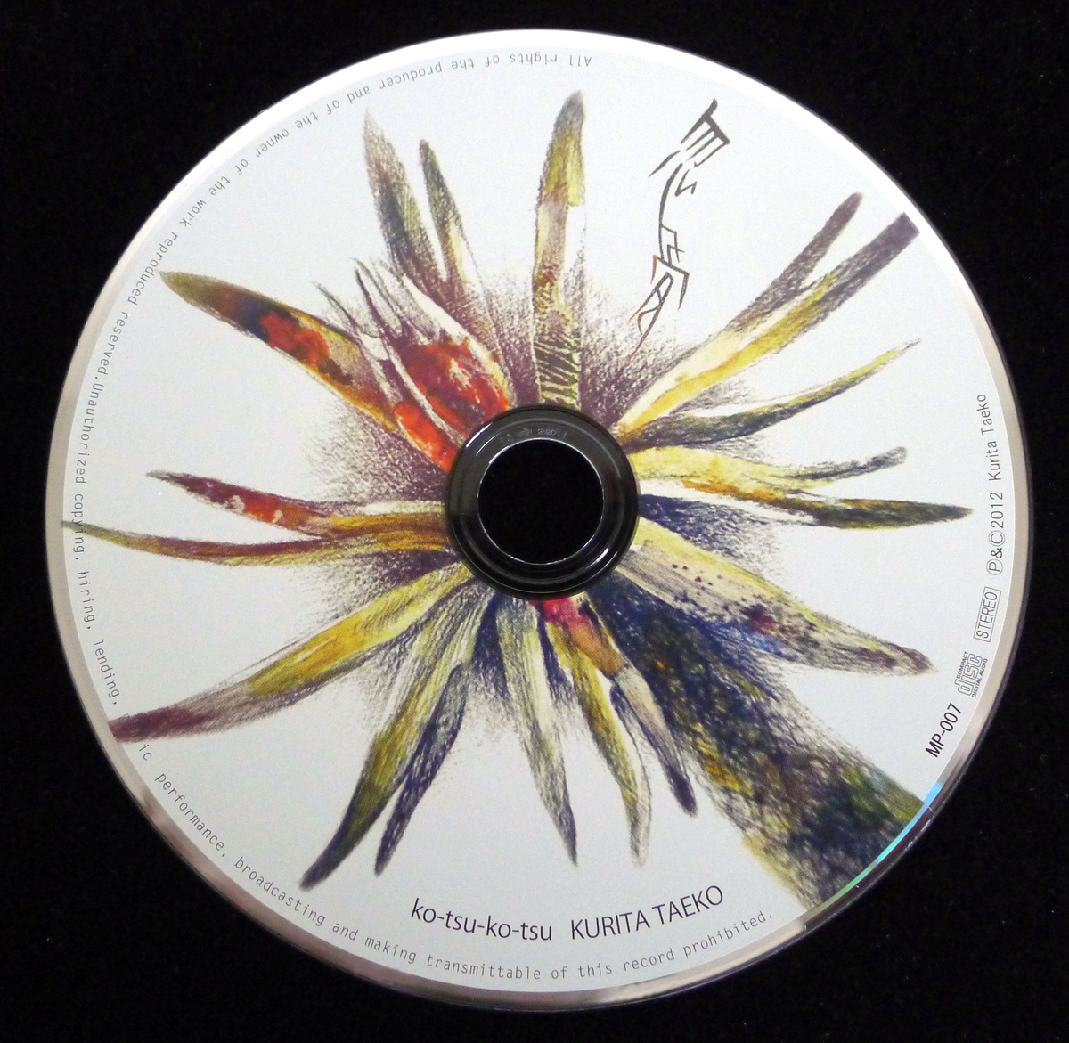 The album title also provides an interesting diversion for language-inclined listeners. The title ko-tsu-ko-tsu is printed on the cover, and the characters 忽骨 are also present, vertically drawn out and connected on the right side of the striking illustration. Ko-tsu-ko-tsu written in Japanese kanataka is コツコツ. This is a common Japanese onomatopoeia word meaning steadily progressing little by little towards a goal, and can also represent the sound of rhythmic tapping, knocking, and footsteps. As for the kanji, each of the characters 忽 and 骨 can be individually pronounced as ko-tsu, doubled up as 忽骨 to make the full album title and the katakana word ko-tsu-ko-tsu. This two-character, two-homophone compound made up of these two kanji characters isn't a common word, but Kurita combines them in this wordplayish way like a pun or double-meaning to create a novel connotation. In this case, the two characters represent sudden and bone (or backbone/spirit/knack), an interesting visceral context to add to the title of her album and to set a distinctive mood, a mood reinforced by the fantastic cover art and the tap-tap rhythm and clicking friction of the sound of ko-tsu-ko-tsu itself.