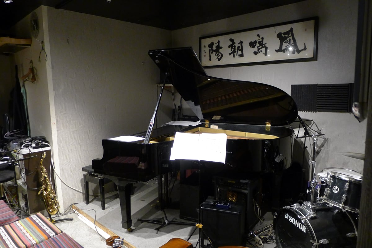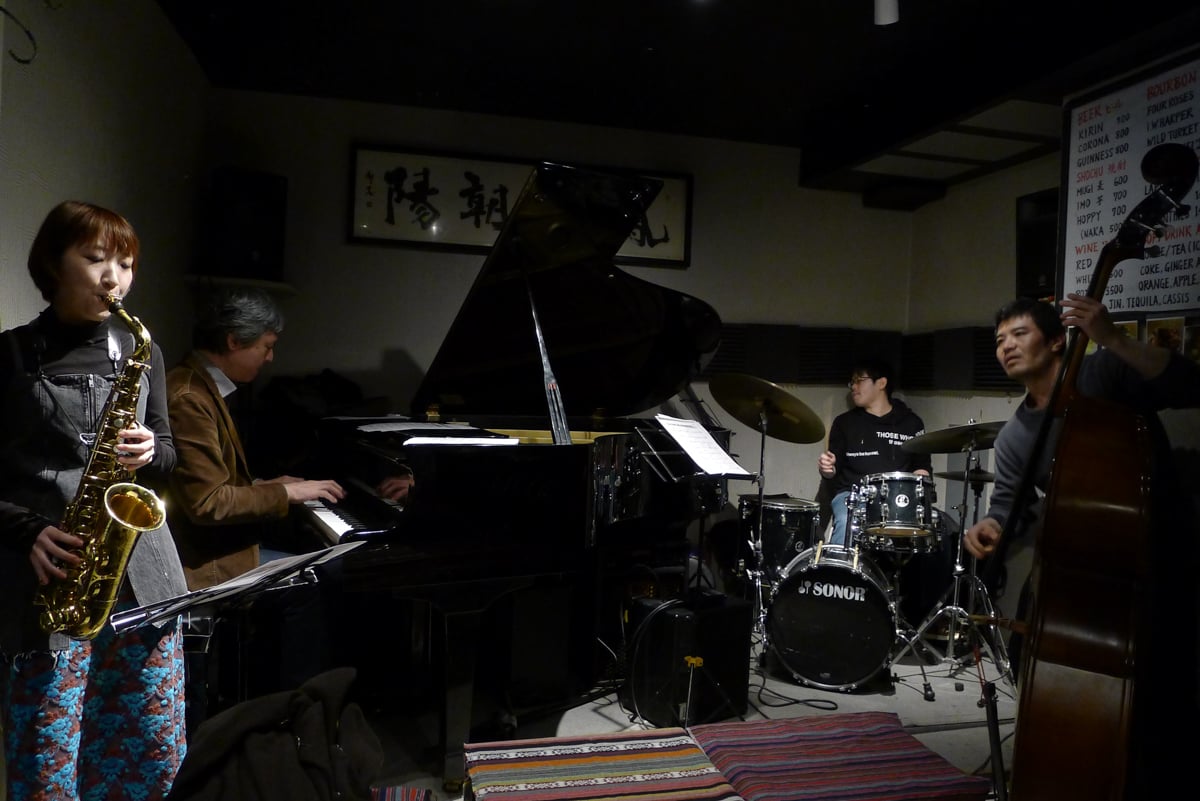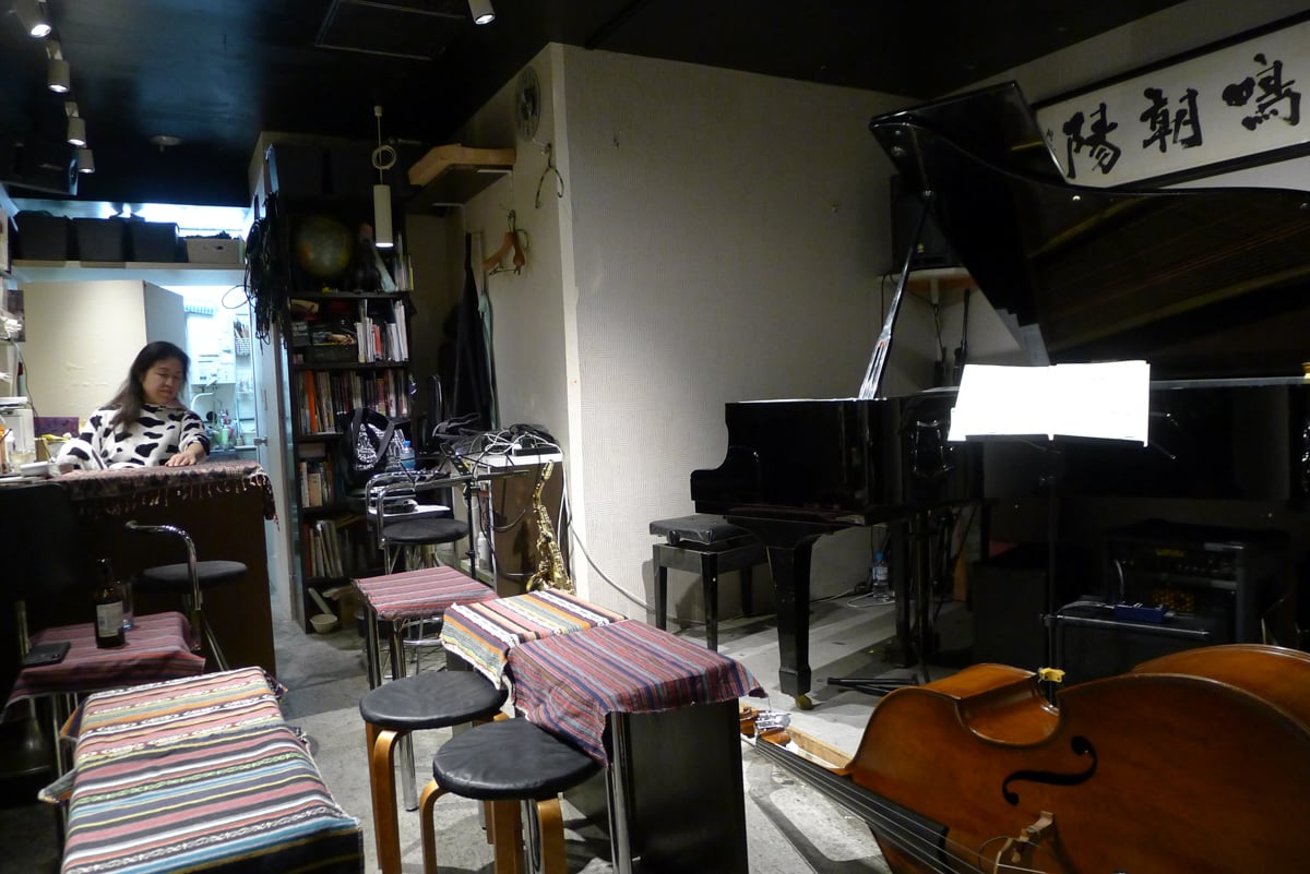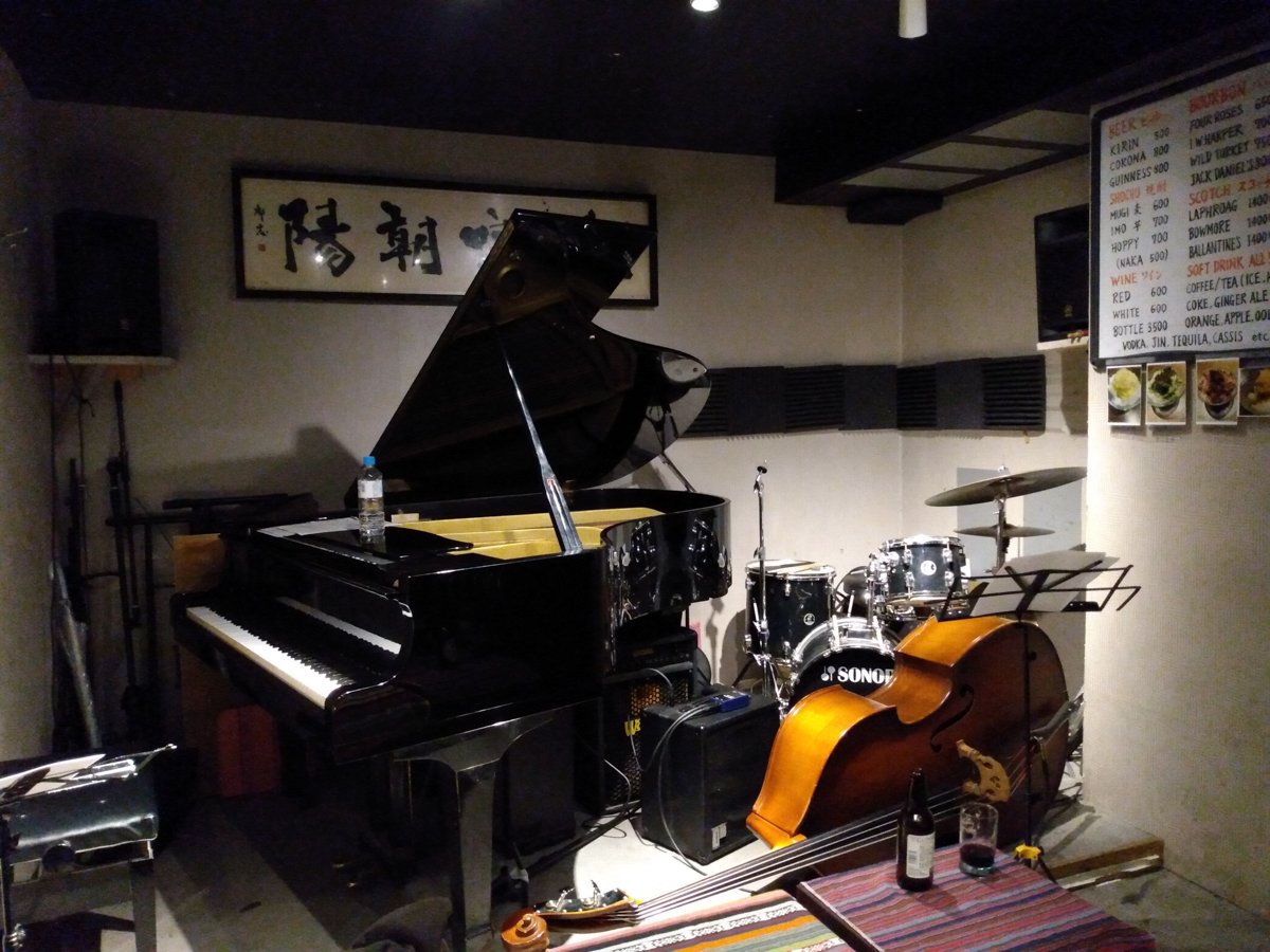 After the first three years, Thelonious moved to a second location nearby, operating there for roughly eleven years. This second location occupied a basement-level space right across the street from the Higashi-Nakano train station. The space was separated into two rooms, basically a front bar/lounge area and a back room for live jazz performances and jam sessions. This back room held soft couch-style seats and small tables next to the stage area, with more chairs and seats extending back into a hallway that bridged the front and back rooms. Approximately four to six listeners in the backroom jazz area would have the best (and loudest) spots, right up front with the musicians, and the remaining guests would fill out the seats further out into the hallway. It was here where hundreds of jazz performances and jam sessions were held, helping to bring Thelonious into its own as a highly appreciated jazz spot regularly supported by musicians and fans.