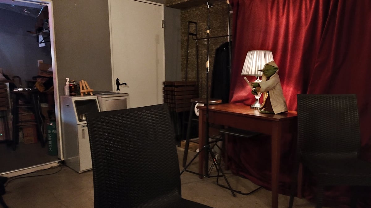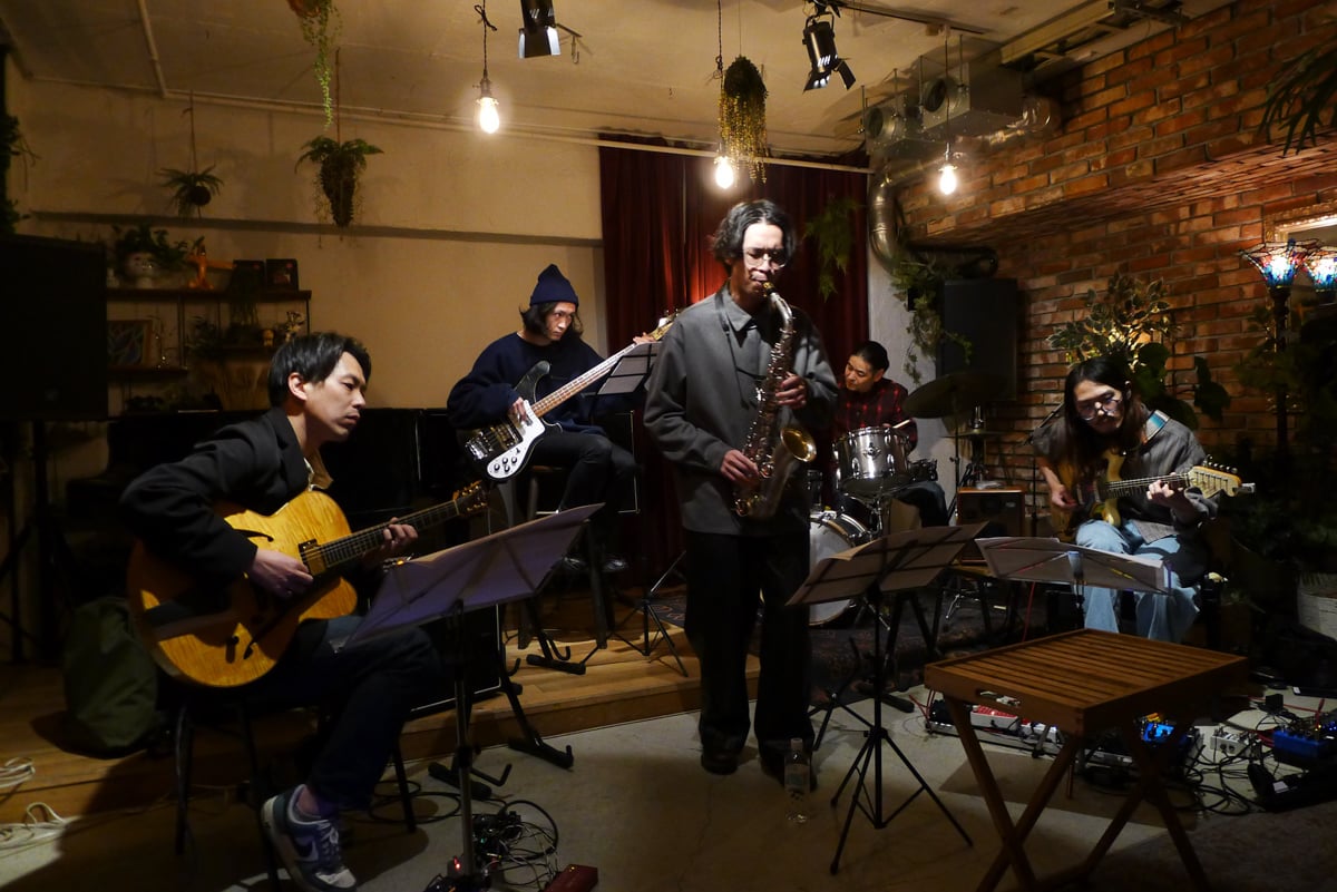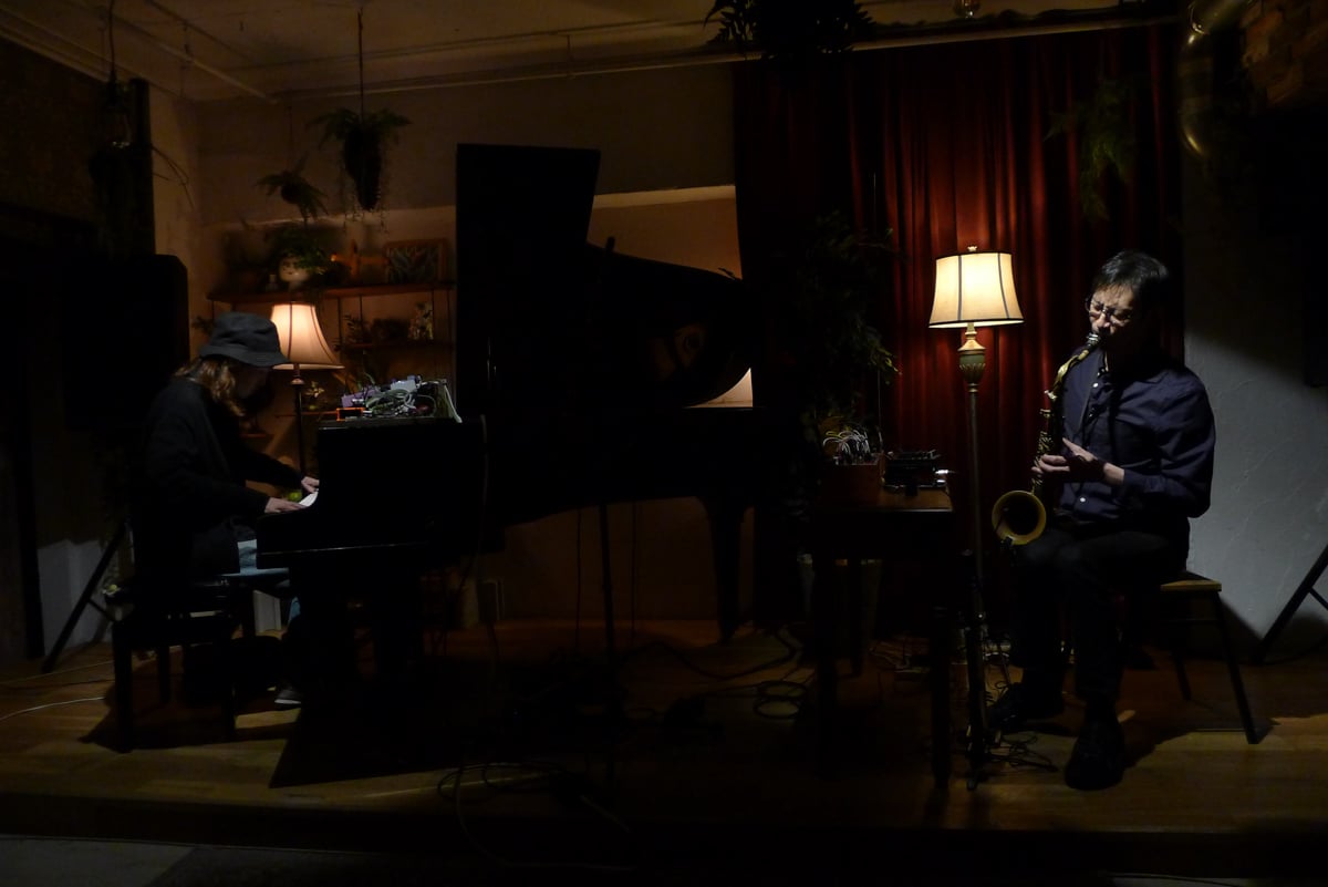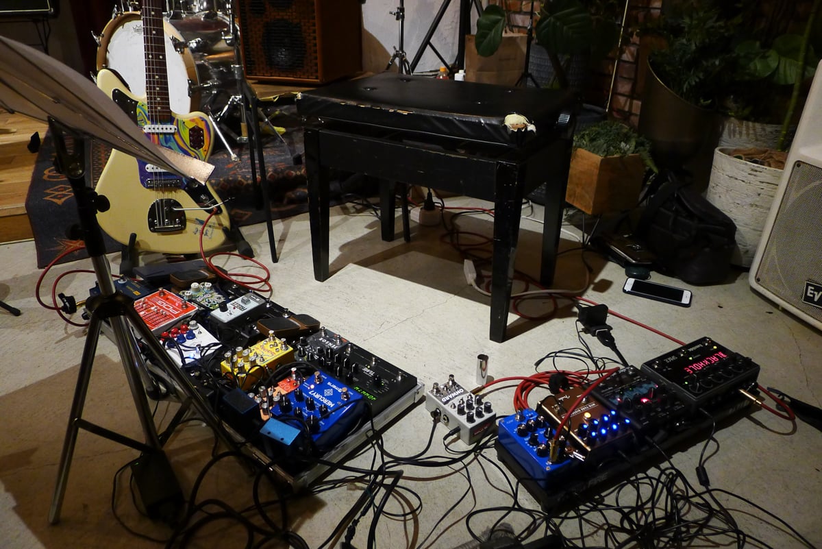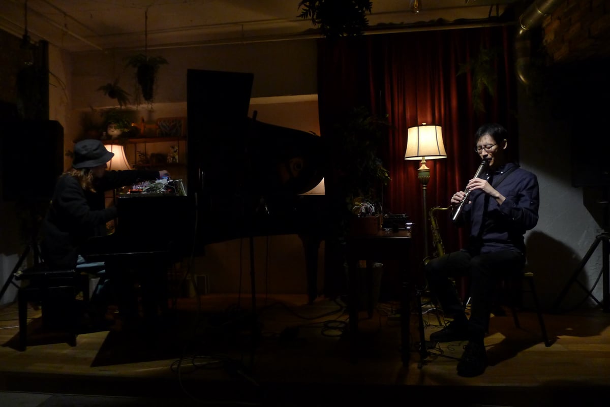 One regular act at Velvet Sun is fretless electric bassist Ryoji Orihara’s BGA (Back Ground Ambient) experience, where he conjures “transparent furniture”. It’s intentionally not a music performance, much less BGM (Back Ground Music), but rather sounds and effects layered upon the environment while listeners are encouraged to read, drink, study, or do as they like during the session.