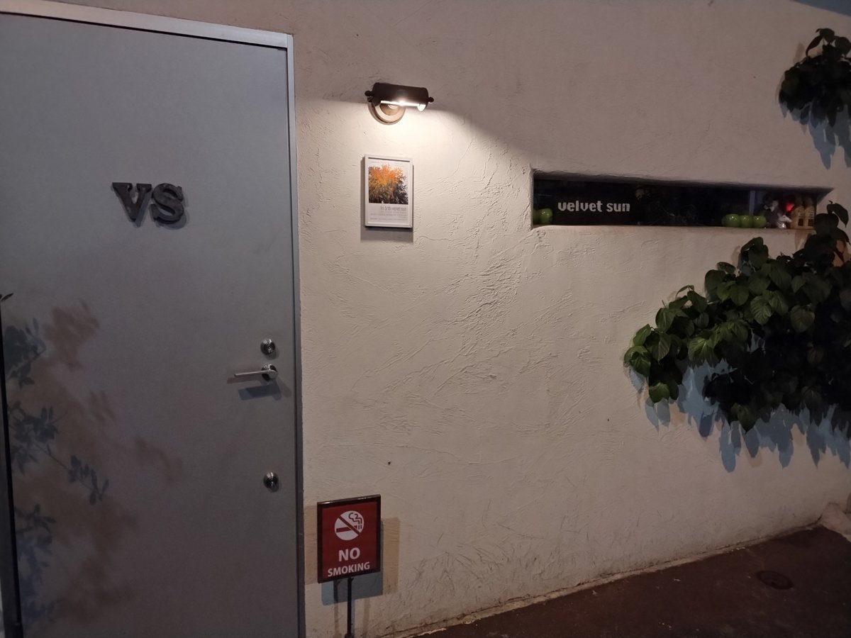 After a peaceful ten-minute stroll from the station to the venue, which works wonders to create a sense of distance and travel, taking in Velvet Sun’s distinctive outer appearance sets a special tone. There is a mostly blank white wall with a narrow, oblong window slotted in the center, lined with shadowy bottles and shapes illuminated by subdued light coming from the interior. The name velvet sun is printed inconspicuously on the window, and a VS marks the door. The overall façade conveys the feeling of arriving at a cozy hideout on an alien planet, something from Star Wars, or a place where a giant star was created out of soft black fabric.