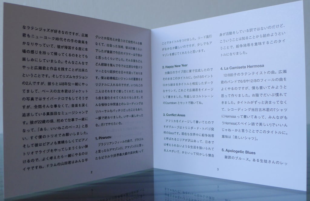 Also, this time there are more Latin songs. I like contemporary Latin jazz, and Hirose often played in that style while in New York. I always looked forward to seeing him every time he returned to Japan with the authentic feel of that kind of music. And, after all this and that, I was finally able to release something with Hirose.