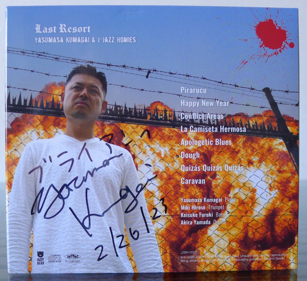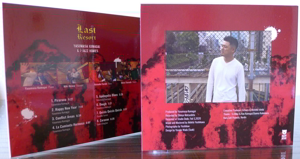 The latest album from J Jazz pianist Yasumasa Kumagai is titled Last Resort, released in 2020 on his own independent label with his jazz piano trio plus Miki Hirose on trumpet. Although the eye-catching cover design may be a world away from typical jazz albums, the aggressive, tongue-in-cheek image succeeds in standing out, a conscious attempt to challenge flagging CD sales in recent years by piquing interest and possibly head-scratching confusion.