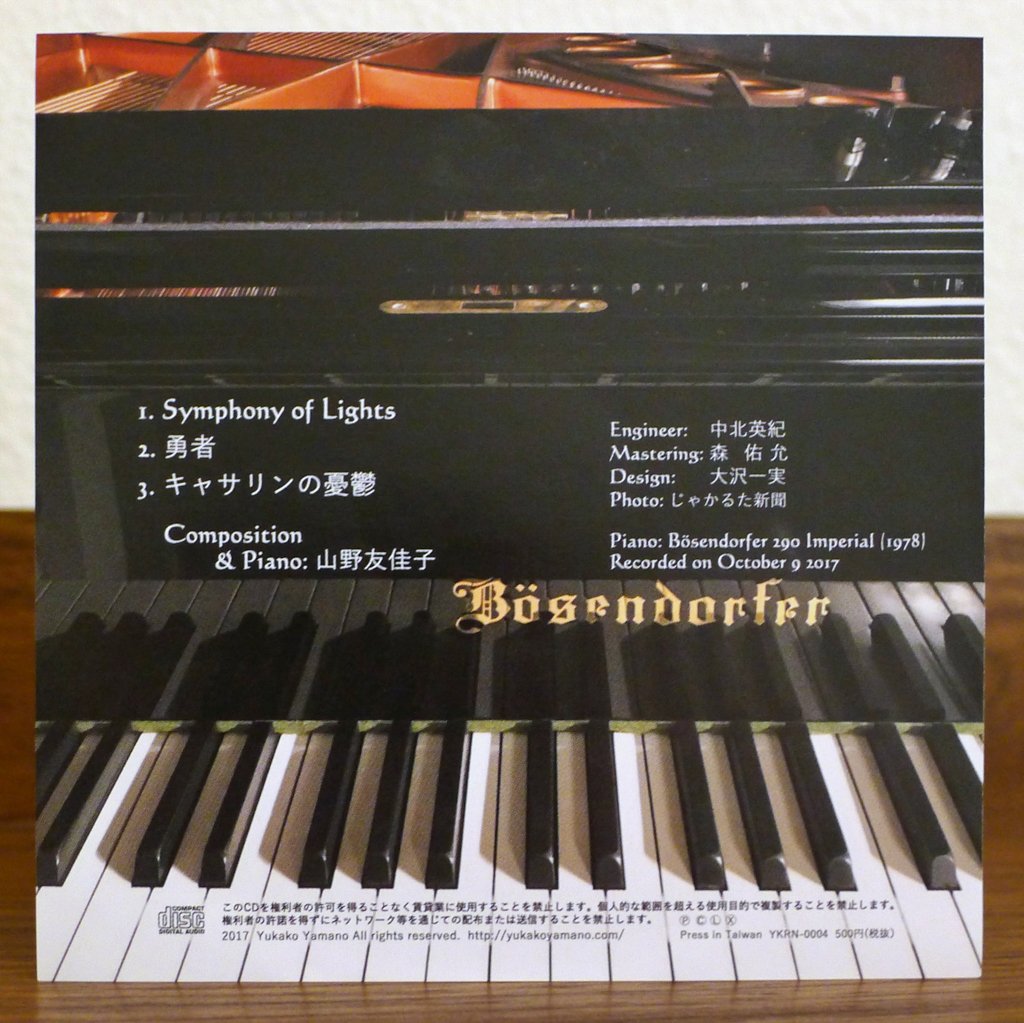 Pleased with the result of the piano’s sound, Yamano decided to release the session to share the beautiful sound of the Imperial Bösendorfer. As an unplanned album produced in quick order, she offered the CD in a simple package at a handy “one-coin” price of 500 yen (about \$3.50 USD).