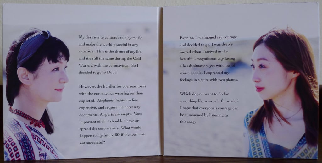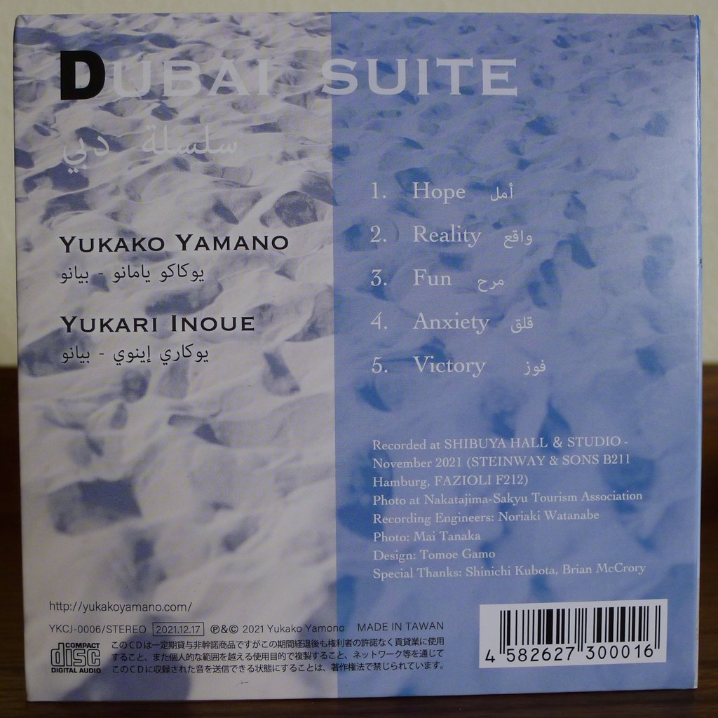 The pianist’s November 2020 trip to Dubai was her first overseas tour since the pandemic began. Although there were new hurdles like testing, quarantine, cancelations, and a great deal of uncertainty involved, it was a rewarding experience for the pianist, and she found an even deeper appreciation for traveling and sharing music with people around the world. With these impressions, Yamano created this suite in a burst of inspiration - including her instinctive decision to arrange the music for two pianos. Pianist Yukari Inoue, a popular, skilled, and in-demand pianist in the Tokyo jazz scene, was a natural choice for a musical partner on this album. Fortunately, the album was able to be recorded and produced in short order, and Yamano brought copies of the CD along with her on her second trip to Dubai in December 2021.