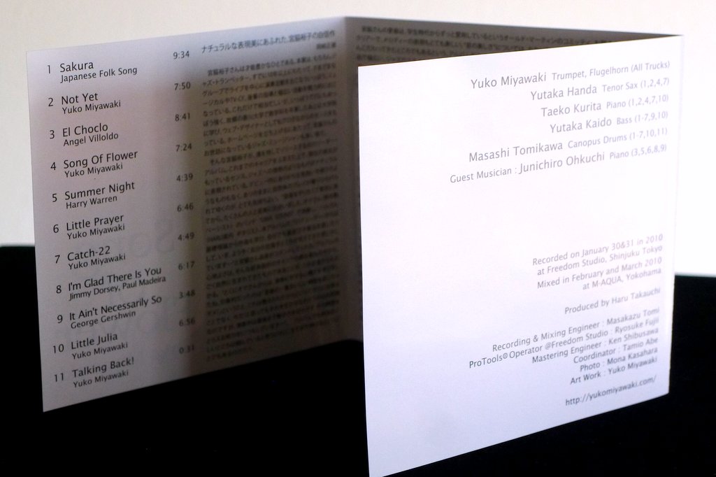 In addition to her compelling horn playing, Miyawaki’s contributions also include original songs and arrangements, all showing a creative style with modern themes calmly developing over sharp grooves with fascinating frameworks. The selected cover songs include a great modern jazz version of the Japanese folk song “Sakura”, the atmospheric latin tune “El Choclo”, “Summer Night” in uptempo swing, and a tender duo with guest pianist Junichiro Ohkuchi (joining on five songs) on the heartful ballad “I’m Glad There Is You”.