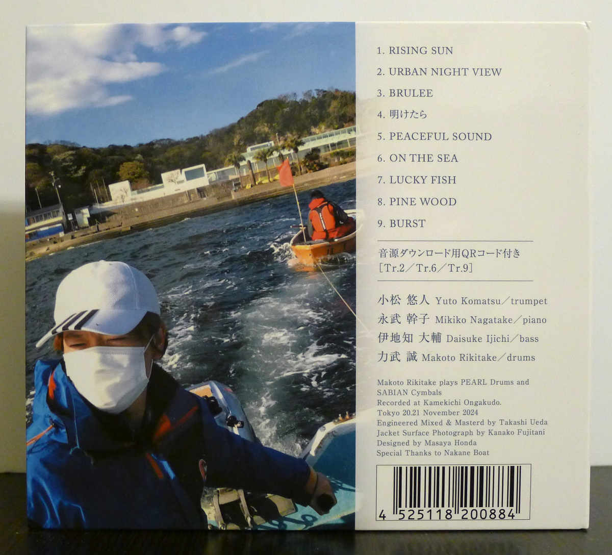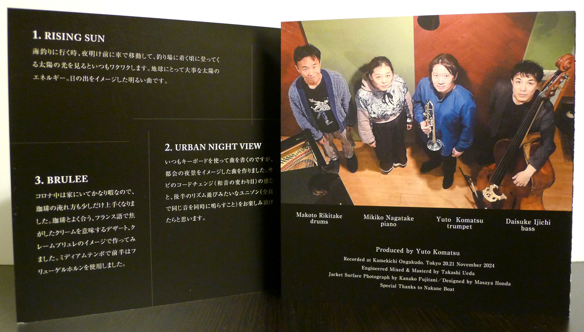 The title Defune is a rendition in English of the Japanese word 出船 (デフネ, deh-foo-neh, setting sail, departing from port), which is a perfect fit for Komatsu. In addition to music and jazz trumpet, sea fishing is also a part of the leader’s lifestyle, and several of the songs are thematically linked to his hobby. There’s the opening track “Rising Sun” where the quartet’s live and present sound immediately tunes listeners into the group’s positive energy. Similar in theme, tracks #4 “Aketara (When It Comes to Dawn)” (a deeper groove), #6 “On the Sea” (a comfortable bossa), and #7 “Lucky Fish” (a boppy swinger) dip into his same source of oceanic inspiration also shared through photos throughout the CD.