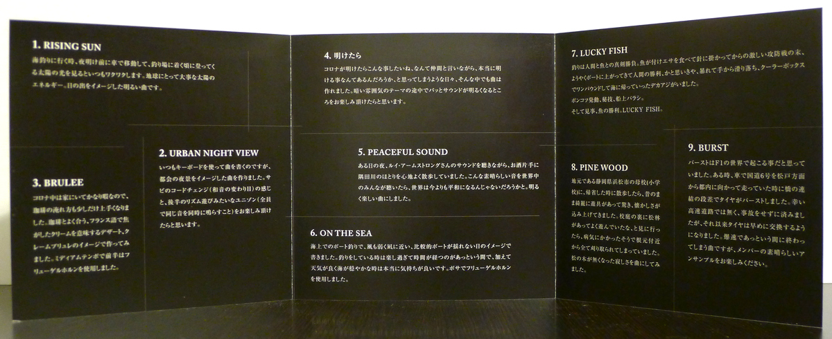I had thought that bursts were things that happened in the world of F1. Then, one day, I was driving on Japan National Route 6 from the Matsudo region to Tokyo when my tire burst at an uneven bridge junction. Fortunately, I wasn’t on the highway, and I managed to avoid an accident. But ever since then, I’ve tried to change my tires sooner rather than later. This song is explosively fast and ends before you know it, but I hope you enjoy the ensemble performance of the band.