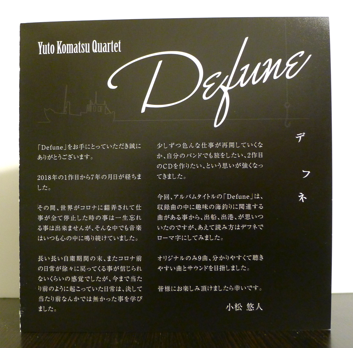 This album’s title of Defune relates to songs from the recording having to do with my hobby of fishing at sea. I came up with some titles like setting sail and leaving port (出船, 出港), but I chose to purposely use English characters for the title.
