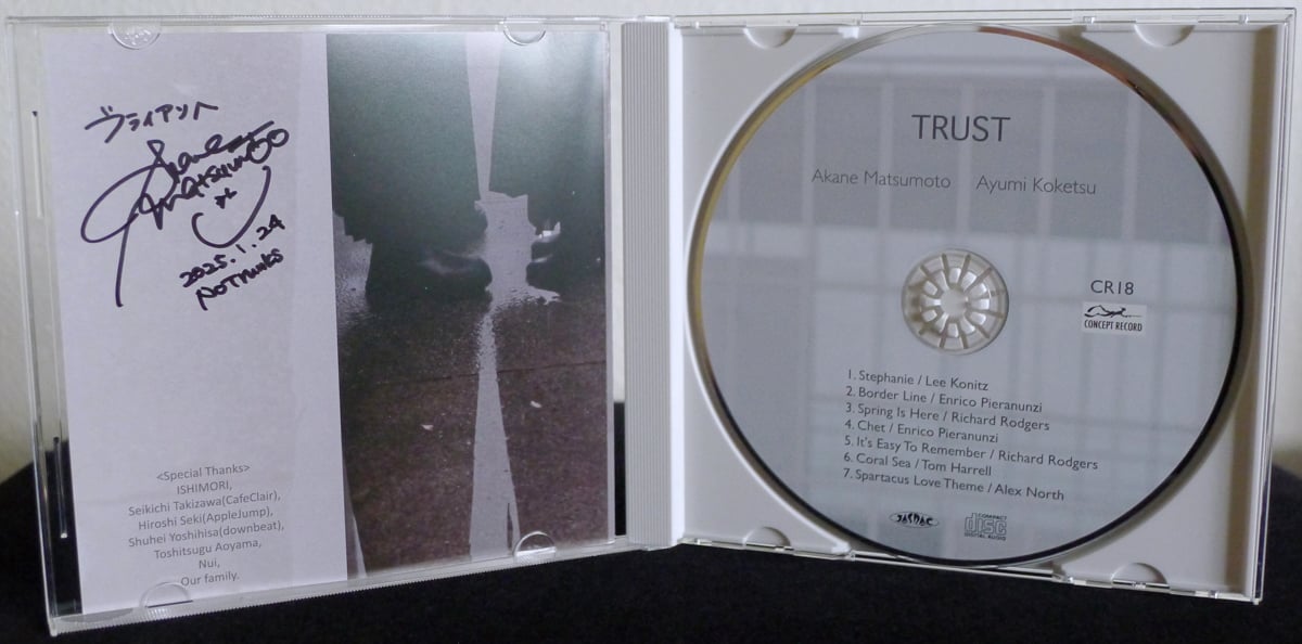 Twelve years have passed since the start of this duo. We’ve played together so many times that it’s impossible to count. We’ve raised each other through trial and error, playing each of our compositions and interpretations of many jazz originals, and always striving for an even better sound day by day. Through tours of the country and conversations about many things, we’ve discussed everything from our music to thinking more deeply about our individual characters. Along with the respect we have for one another, I believe that we’ve built a relationship based on absolute mutual trust. At this point in time, with the accumulation of these many years since we started, it felt right and somehow inevitable to create a duo album together, and it’s very moving for me. We made Trust wholeheartedly while thinking about the path we’ve walked together over these twelve years. Here’s to the hope that this album can touch people’s hearts, whether one person or as many people as possible. (Ayumi Koketsu)