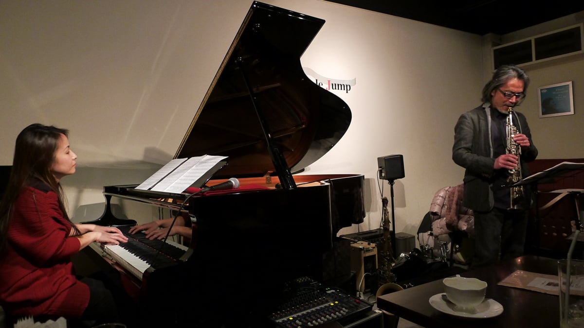 Depending on the day, audiences may be treated to a vocal group, a bossa nova band, violin mu bebop, straight-ahead, Latin, or modern jazz. A brief description of the event is usually mentioned on the shop’s online schedule, alongside musicians’ names, start time, and admission price—and, importantly, whether or not the event has already sold out. Apple Jump is a small room and a full booking of advanced reservations is not uncommon, so arriving without a reservation on certain nights can be risky.