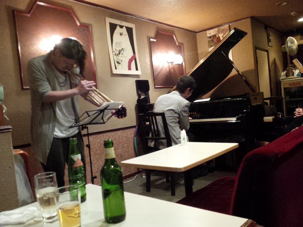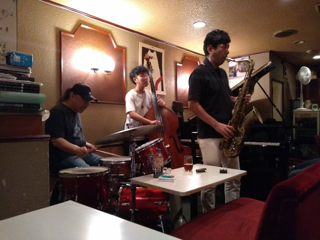 Cochi is a reliably satisfying jazz bar with a friendly neighborhood feel, the kind of place to rub shoulders with local folks while listening to home-ground jazz musicians. Although the room is tiny, the space is well furnished with vintage decor and ambiance, featuring a small bar and a set of tables and low couch seats where you can watch the musicians play within arm’s reach away. In fact, the nearest front table offers an up-close-and-personal experience, basically sharing floor space with the musicians, alongside a bass drum and cymbal stands on nights when drums are featured—a really nice way to get into the music.