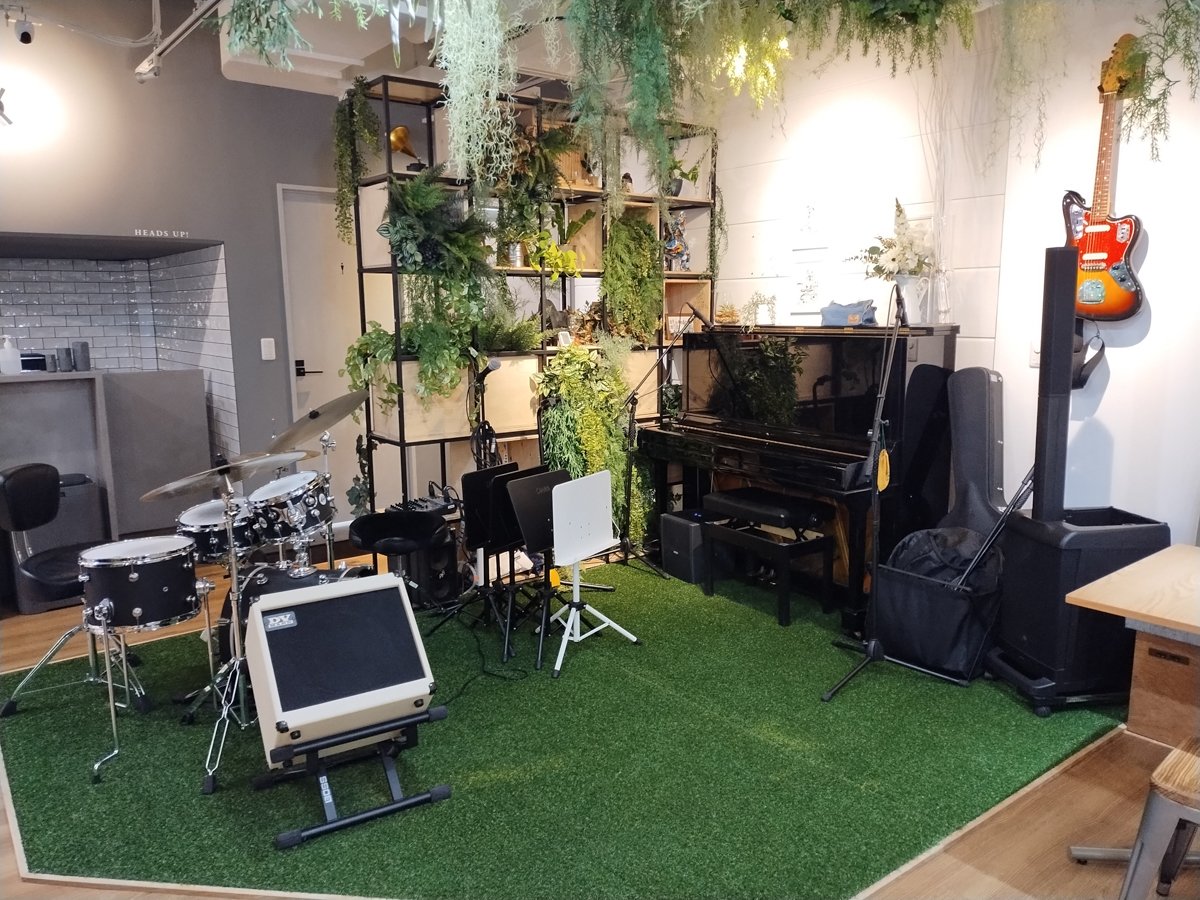 The well-lit room is cheered up with plastic plants and greenery placed throughout and hung from the ceiling. This creates a natural and peaceful atmosphere meant to convey the sense of an outdoor patio concert. This nice touch helps to prevent the typical office tedium which can be felt in generic, sterile workplaces.