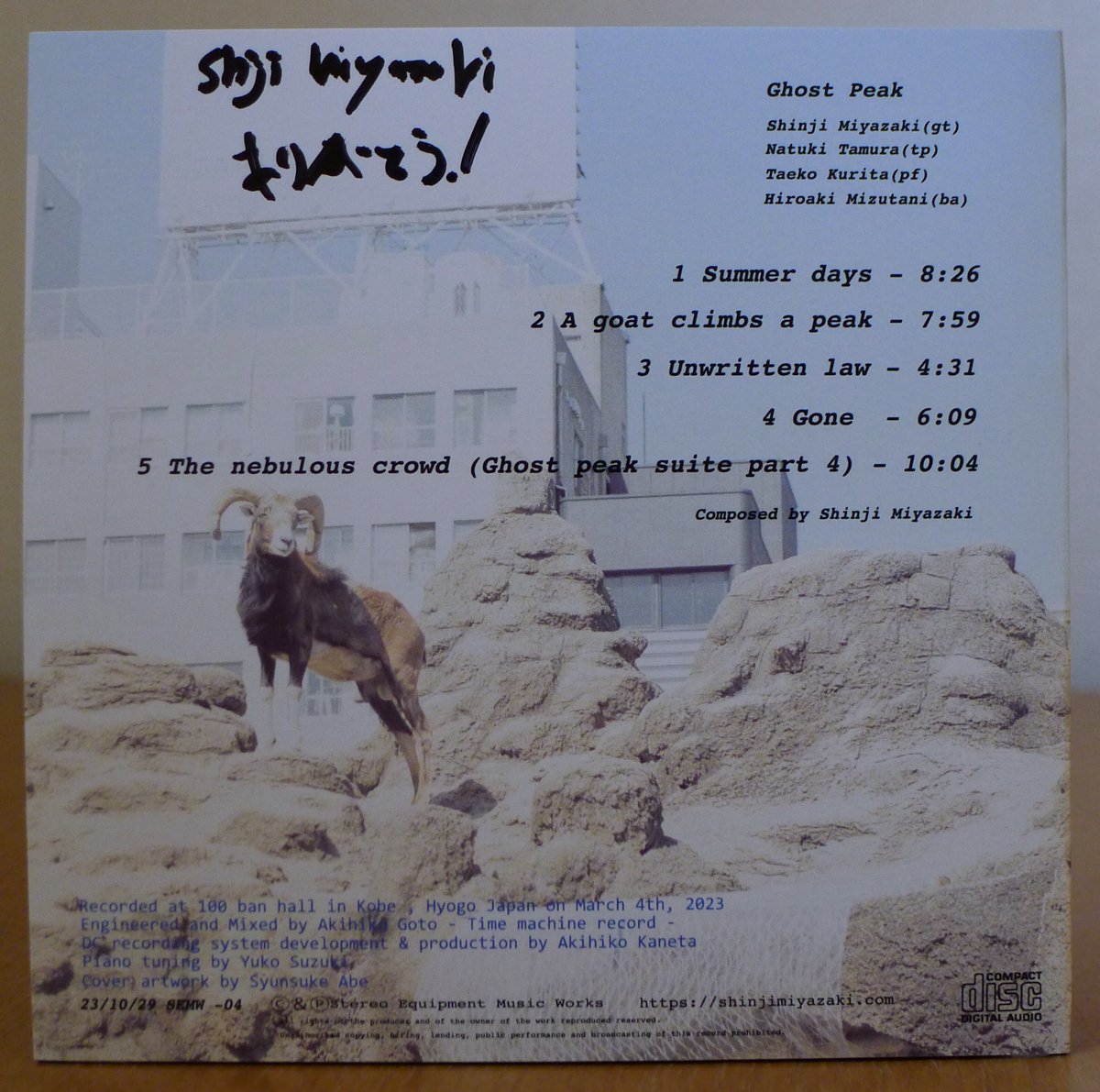 Ghost Peak’s The Goat on a Peak contains five of Miyazaki’s original compositions and was released on the heels of their first release Ghost Peak 1. The audio for these two albums was recorded at a live concert in Kobe in 2023. While the first release was an online-only streaming/digital download, this second album was released as a compact disc with a different set of songs.