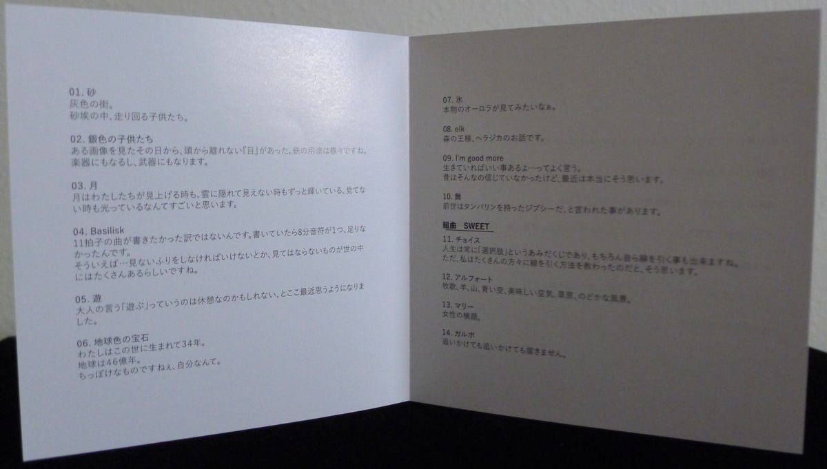 Most of the album consists of her other, longer composed songs, averaging about four to five minutes each. It is on these songs where Aikawa has her special guests join her to make up a different format from song to song — not only do the guests change, but she herself switches between different instruments, like Afro-Peruvian cajón, hand drums, cymbals, chimes and bells, and marimba, vibraphone, and xylophone. Aikawa and her guests combine in duo and trio forms such as Aikawa plus piano (Masaki Hayashi and Eri Uenoyama), Aikawa plus alto sax/soprano sax/clarinet (Hiroshi Suzuki), and Aikawa plus vibraphone (Megumi Hattori). Some of these group-based highlights are found on track #2 “Silver Children” with its ancient folk style melody with subtle jazz elements, the exciting 11-beat meter #4 “Basilisk” with its tricky shapes and lines, the refreshing early morning sound of #6 “Earth-colored Gem” (where Aikawa plays mallets, piano, and all other instruments alone), the dramatic and adventurous #8 “elk”, and the entrancing #9 “I’m good more.”