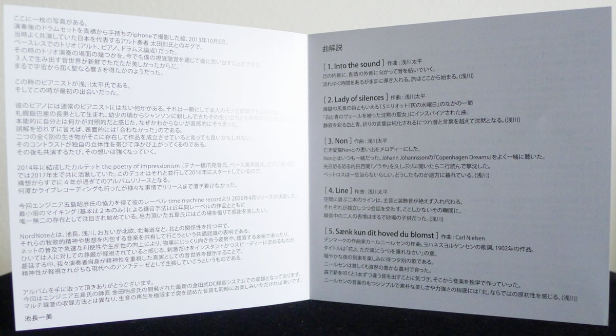 In this case, through the cooperation of engineer Akihiko Goto, we completed this album release on his label Time Machine Record in April 2020. The recording method of using a minimal miking technique (basically only two microphones), along with other releases from his label, has begun to attract attention as a unique presence in recent years. I would like to take this opportunity to express my gratitude to Akihito Goto for his invaluable contributions.