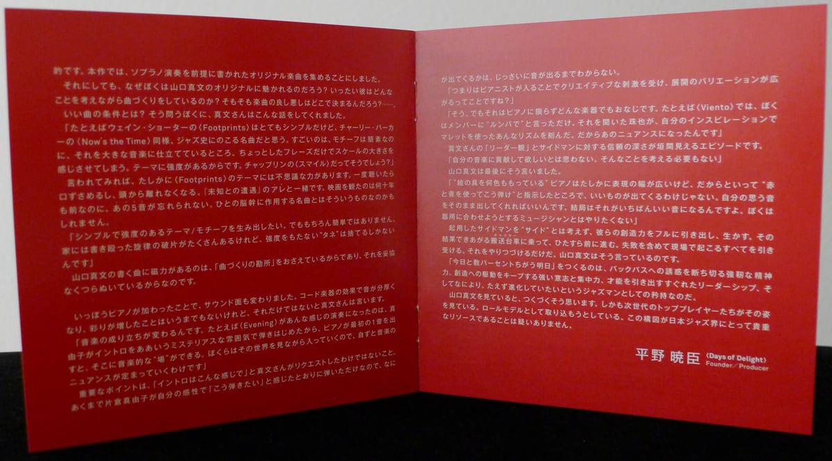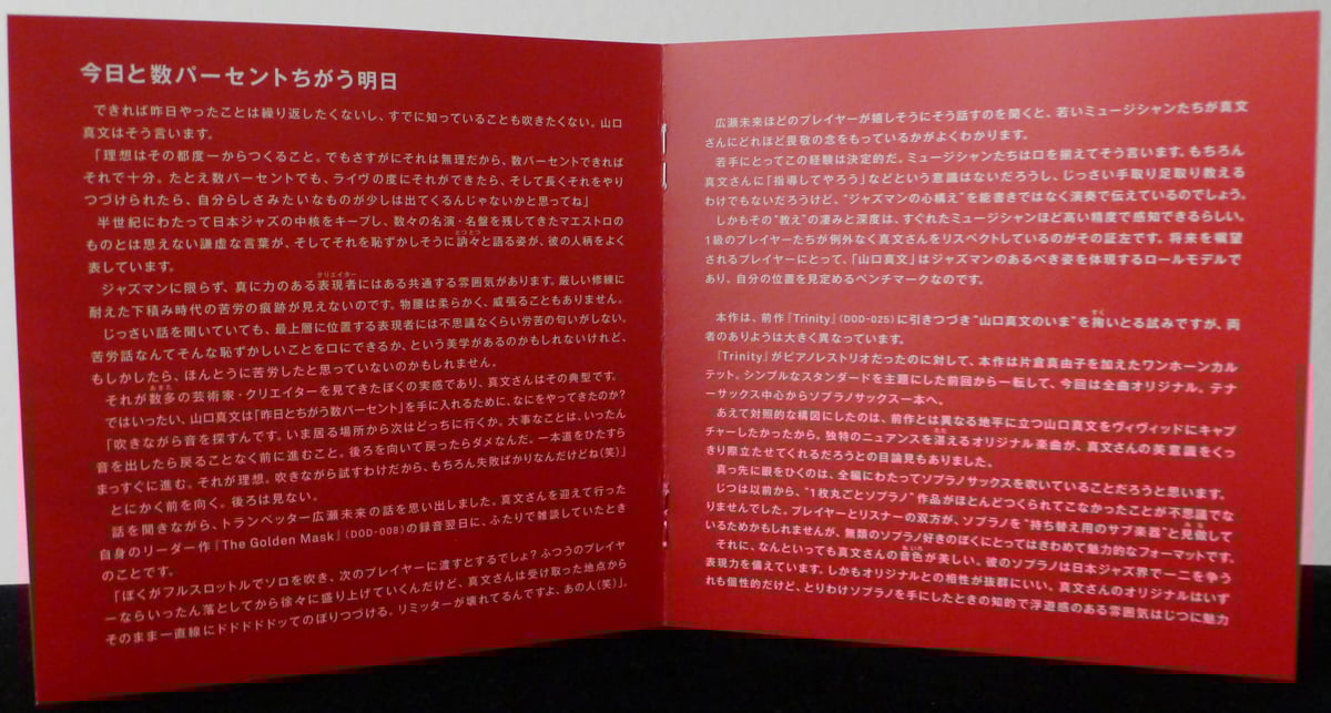 Furthermore, Mabumi’s tone is undeniably beautiful. His soprano has an expressive power that ranks among the best in the world of Japanese jazz. It is perfectly matched to his original compositions, as well. Mabumi’s originals all possess his distinctive personality, but when played with soprano, they take on an intelligent and floating quality that is especially fascinating. For this album, we decided to collect original songs which were written to be performed on soprano sax.
