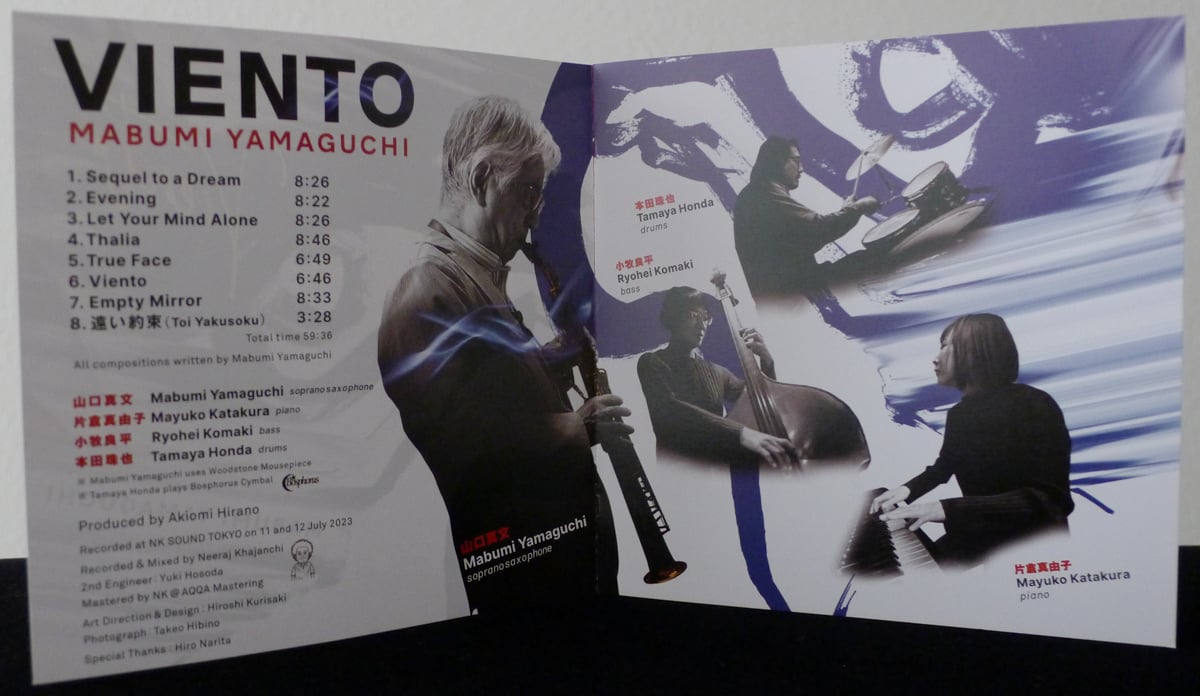 Viento is saxophonist Mabumi Yamaguchi’s second release on Days of Delight following his chord-less trio recording Trinity (2022), but he’s been playing and releasing albums for over five decades. In that time, he’s worked with stellar domestic and international musicians including drummers Motohiko Hino (“best jazz drummer in Japan” award winner throughout the 1970s) and George Otsuka for a landmark 1978 tour with Kenny Kirkland (piano), John Scofield (guitar), and Miroslav Vitous (bass). His recording Mabumi (1981) also featured Kirkland and Vitous with Tony Williams (drums) joining the lineup.