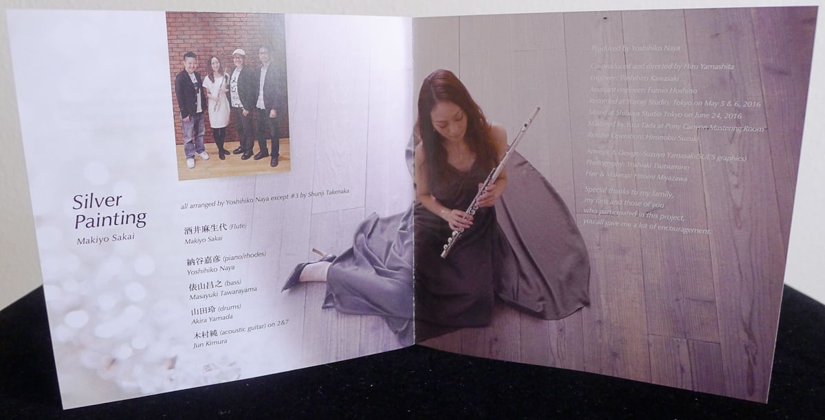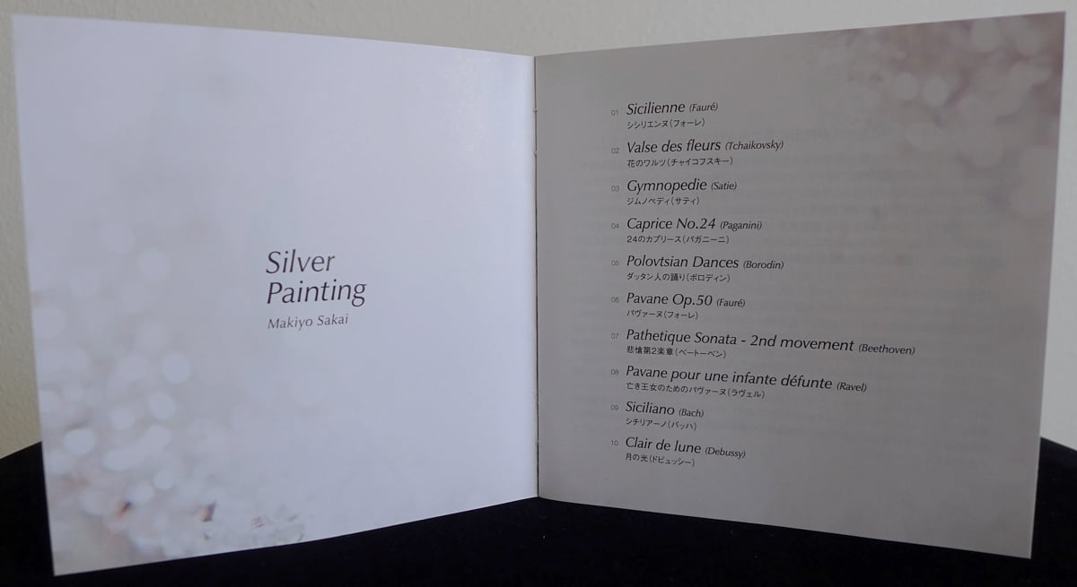 Silver Painting is a fifty-five-minute album featuring Sakai on flute with piano, bass, and drums, with guitar joining on two tracks. The group plays ten songs from the popular classical music repertoire and the great composers. Bach, Beethoven, Borodin, Debussy, Fauré, Paganini, Ravel, Satie, and Tchaikovsky are featured, with one piece from each and two from Fauré.