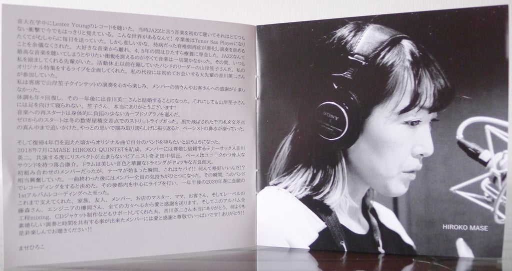 Then, about four years later, I started thinking about starting my band with my original music. The Mase Hiroko Quintet was formed in July 2018. As for the members: Tenor sax Eiji Otogawa, whom I respect and trust. Genius pianist Nobumasa Tanaka, whom I have unending respect for every time we play together. On bass, Kosuke Ochiai with his unique and solid sound. On drums, Sota Kira with a beautiful timbre and magnificently addictive drumming.