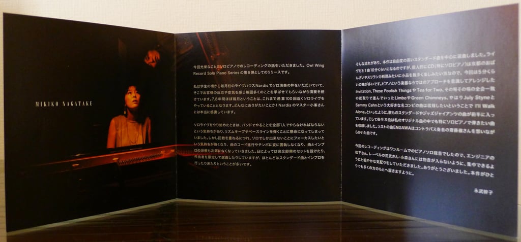 Beginning with an interlude on track ten, “Impro ~Invitation to My Songs~”, the final three tracks consist of the pianist’s original compositions. Following the tour of jazz standards and covers, this second part of the album displays sensitive and melodically rich aspects of Nagatake’s playing and conceptions, perhaps also the additional beauty of vulnerability felt when sharing original compositions, alone at the piano, for us.