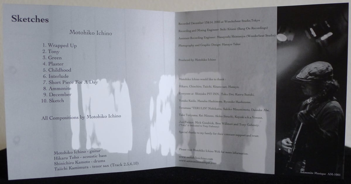Sketches by Motohiko Ichino is a 2007 jazz album featuring Ichino’s guitar trio and quartet playing his original music. At one hour and 5 minutes, the ten songs lay out an atmospheric and subtle sound, one where Ichino’s tonally rich guitar swings and sways with a warm, vintage electric sound through his songs.