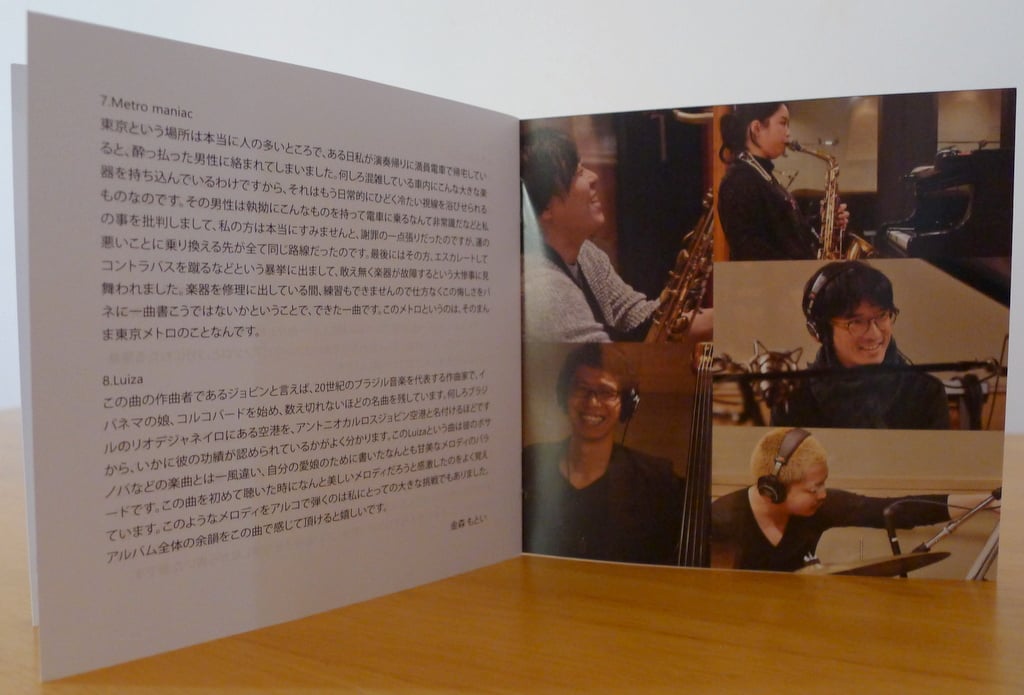 The well-arranged album flows with vim and vigor, music devoted to satisfying listener as well as performer with a fine balance of five originals and three covers: Rogers & Hart’s “Little Girl Blue”, Tizol & Ellington’s “Caravan”, and Jobim’s “Luiza”. Kanamori’s originals also swing and surge on numbers like the opener “No Fool No Fun”, the thrillingly dramatic “幕開け (Open Curtains!)” and the manic “Metro Maniac”, which features a quintet with the addition of an alto sax and tenor sax front line. Wrapping things up softly with the album closer “Luiza”, Kanamori takes the spotlight in piano-bass duo format, where he adorns the melody with bowed strings in a liltingly romantic performance.