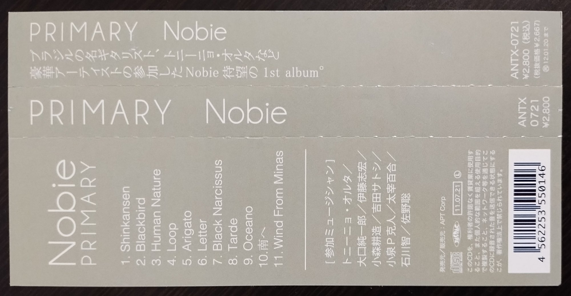 Similarly, on Primary, Nobie sings in Japanese for five tracks, English for three (fitting the finely-rearranged Beatles and Michael Jackson songs and Nobie’s storytelling love song “Letter”), Portuguese on one, and with instrumental voice on “Black Narcissus” (appropriately sax-like), “Shinkansen” (with train station names appearing near the end, naturally), and “Wind From Minas”, closing the album just like it begins, with irresistible rhythms and addictively lovable singing.