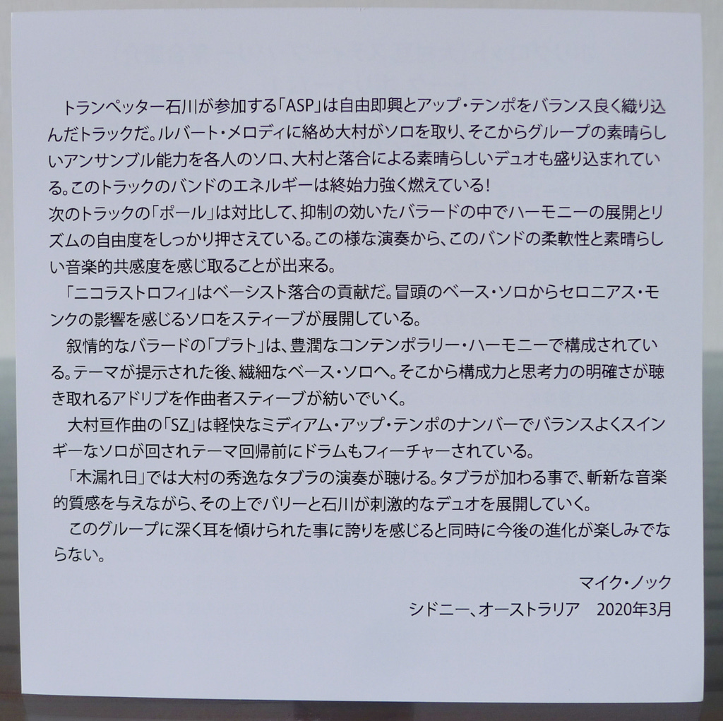 To add to those, these are some very brief impressions, but by no means a substitute for listening to the amazing music. “Nagoya” is actively modern (such as for instance, Danilo Pérez and Danny Grissett trios). “825” paints with pretty palettes and soulful lacing. “ASP” is uptempo and adventurous. “Paul” explores slowly with emotion. “Nicholstrophy” collects Monkish quirks in a barrel. “Plato” is a curious journey. “SZ” excites with stimulating scene changes. And “Komorebi” is a mysterious, slow-moving net of notes, repeating atmospherically.